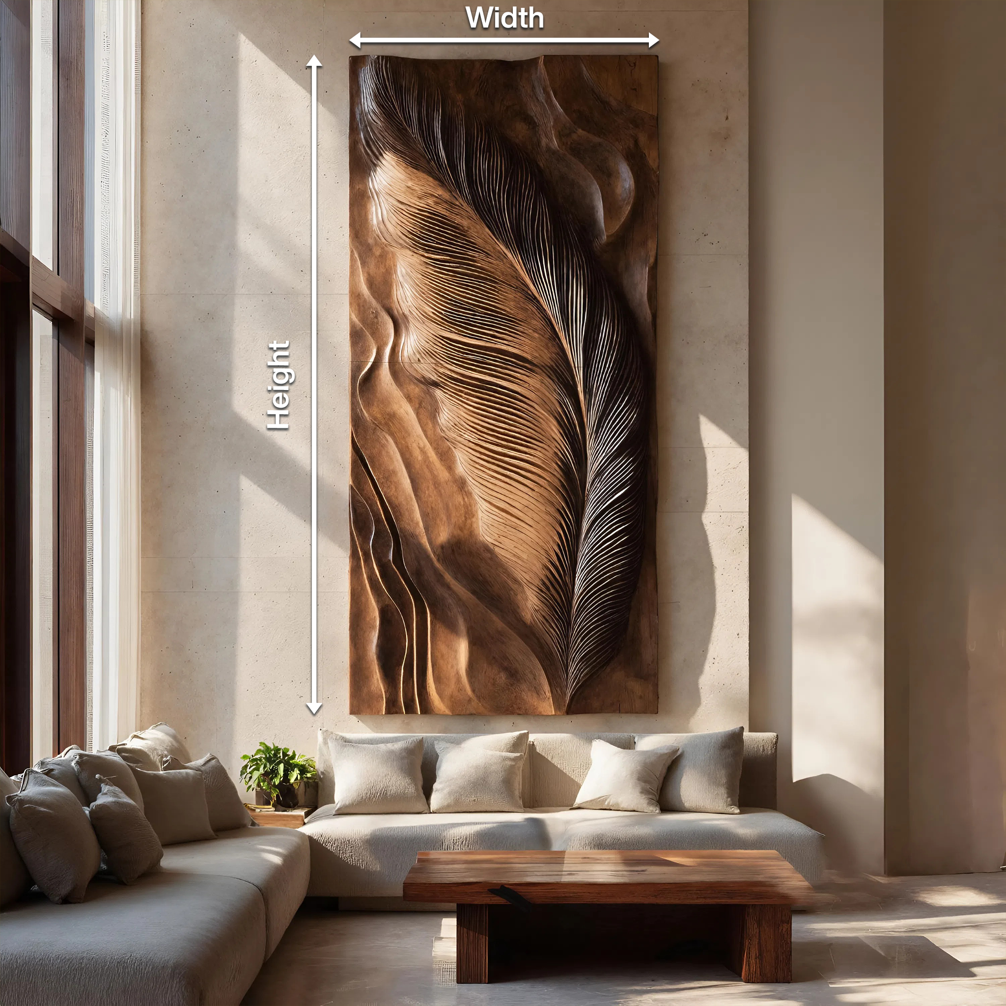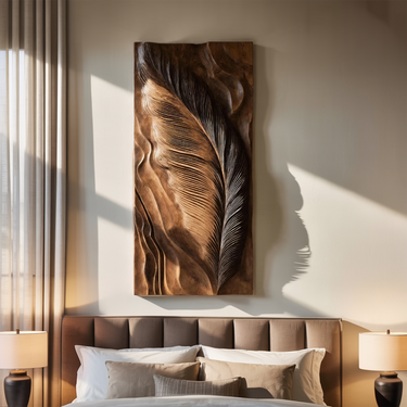 Layered wooden lines unfold across the surface of the Hand Carved Feather Wall Art Design For Home, shaping a vertical wall piece inspired by the natural form of a feather in motion. The carved grooves follow the direction of the wood grain, creating depth and subtle shadow that shifts with changing light. Its elongated composition draws attention upward, allowing the artwork to function as a quiet visual anchor on open walls while adding natural texture and visual flow to the surrounding space.