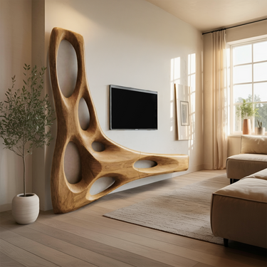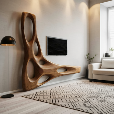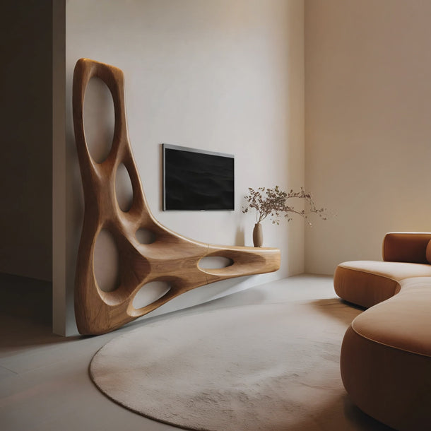 Transform your space with the expressive contours of our Artistic Organic Wall Mounted Media Console For Living Room, a wall-mounted storage piece shaped to introduce movement and visual depth along the wall. Flowing carved forms and open cut-outs create a sense of lightness, allowing the console to feel present without visually weighing down the space.