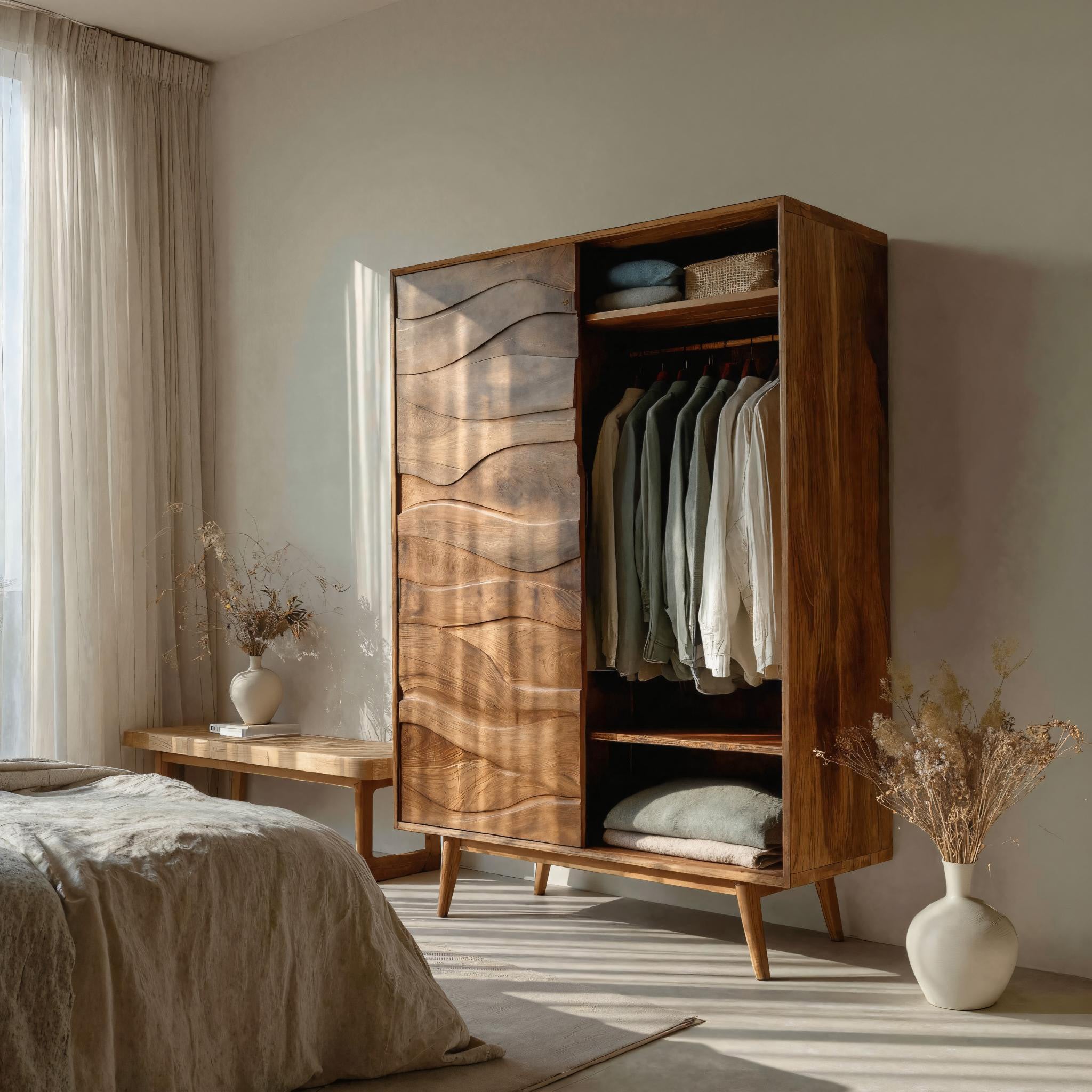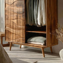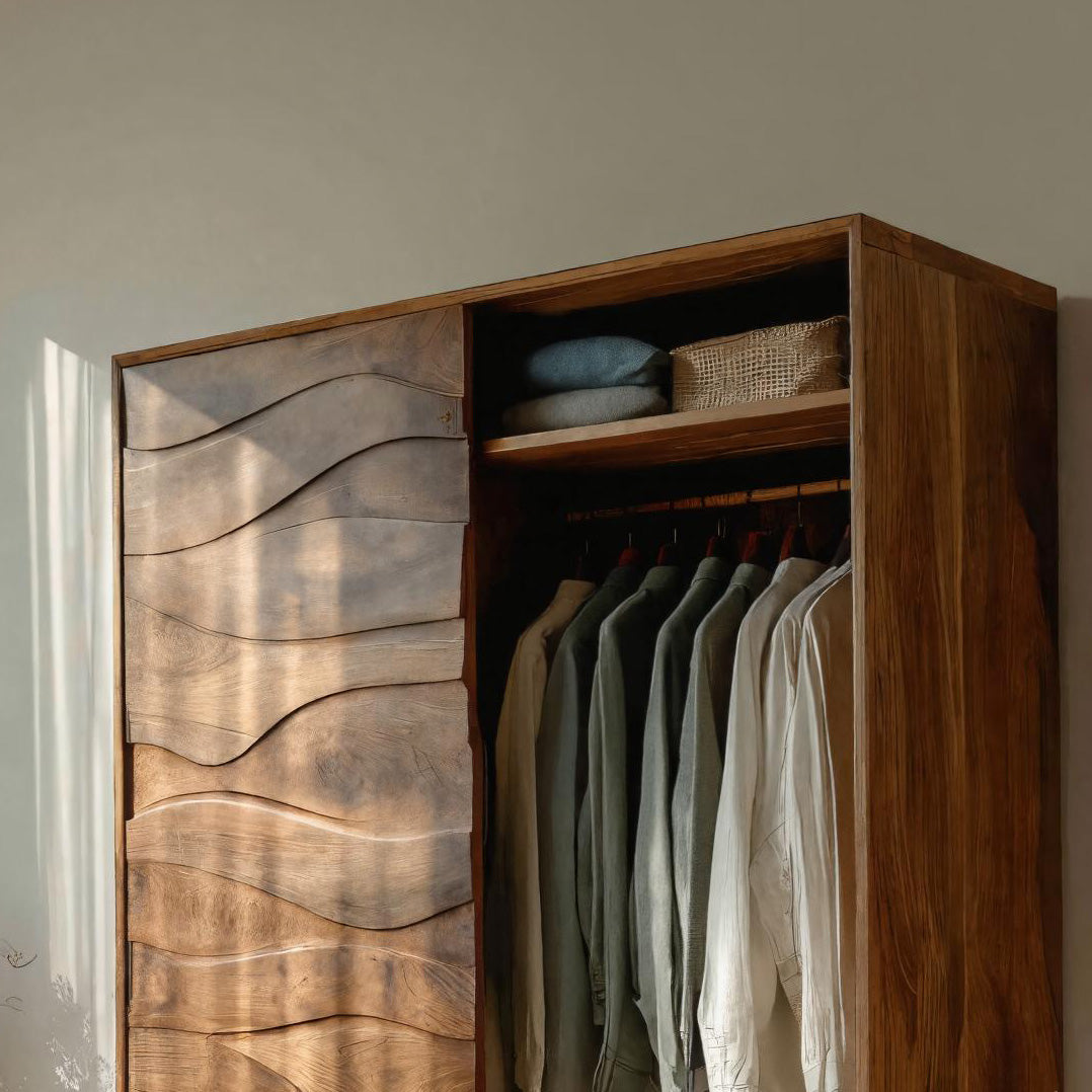 Defined by flowing surface lines and a quietly expressive structure, the Artistic Sculptural Wardrobe For Bedroom Decor Interior introduces storage as a visual element within the room. The wardrobe features a carved wooden door with gently undulating patterns that interact with light and shadow throughout the day. Inside, the layout balances hanging space and shelving, allowing garments and folded items to be stored in an orderly, intuitive way while keeping the overall appearance calm and composed.
