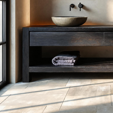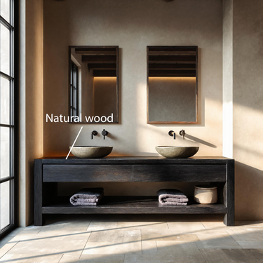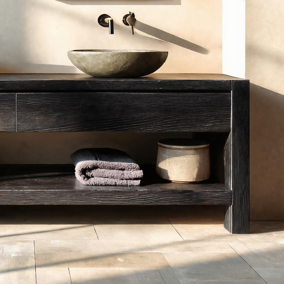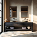 - Functional Benefits: The wide countertop accommodates two vessel sinks while leaving room for daily essentials. Integrated drawers provide concealed storage for smaller items, and the full-length open shelf below offers accessible space for folded towels or baskets. The elevated base structure maintains airflow and keeps the layout visually streamlined.