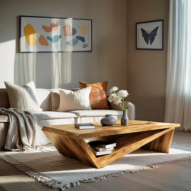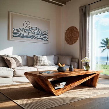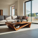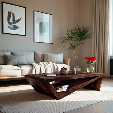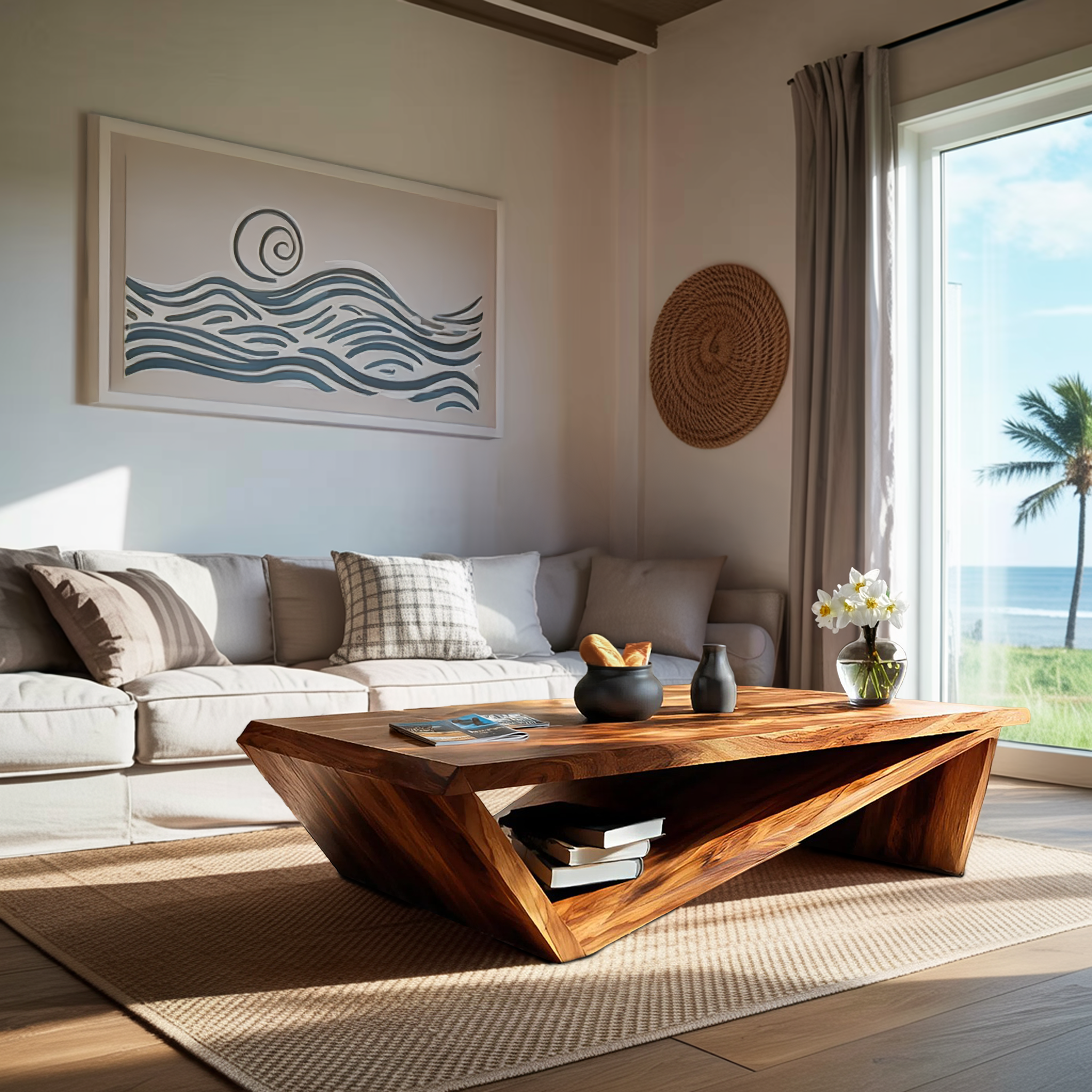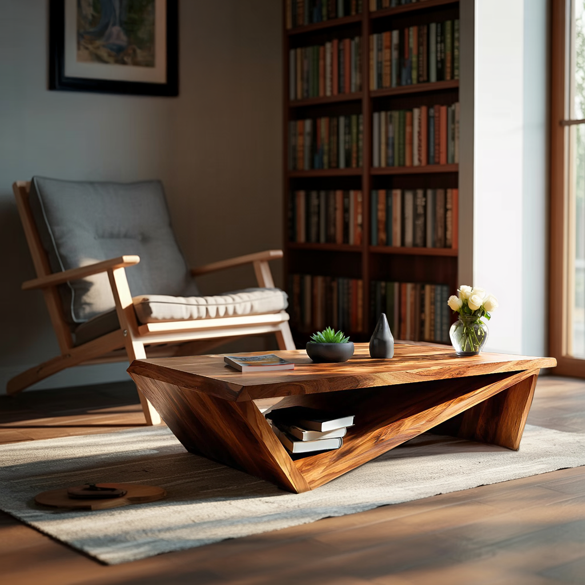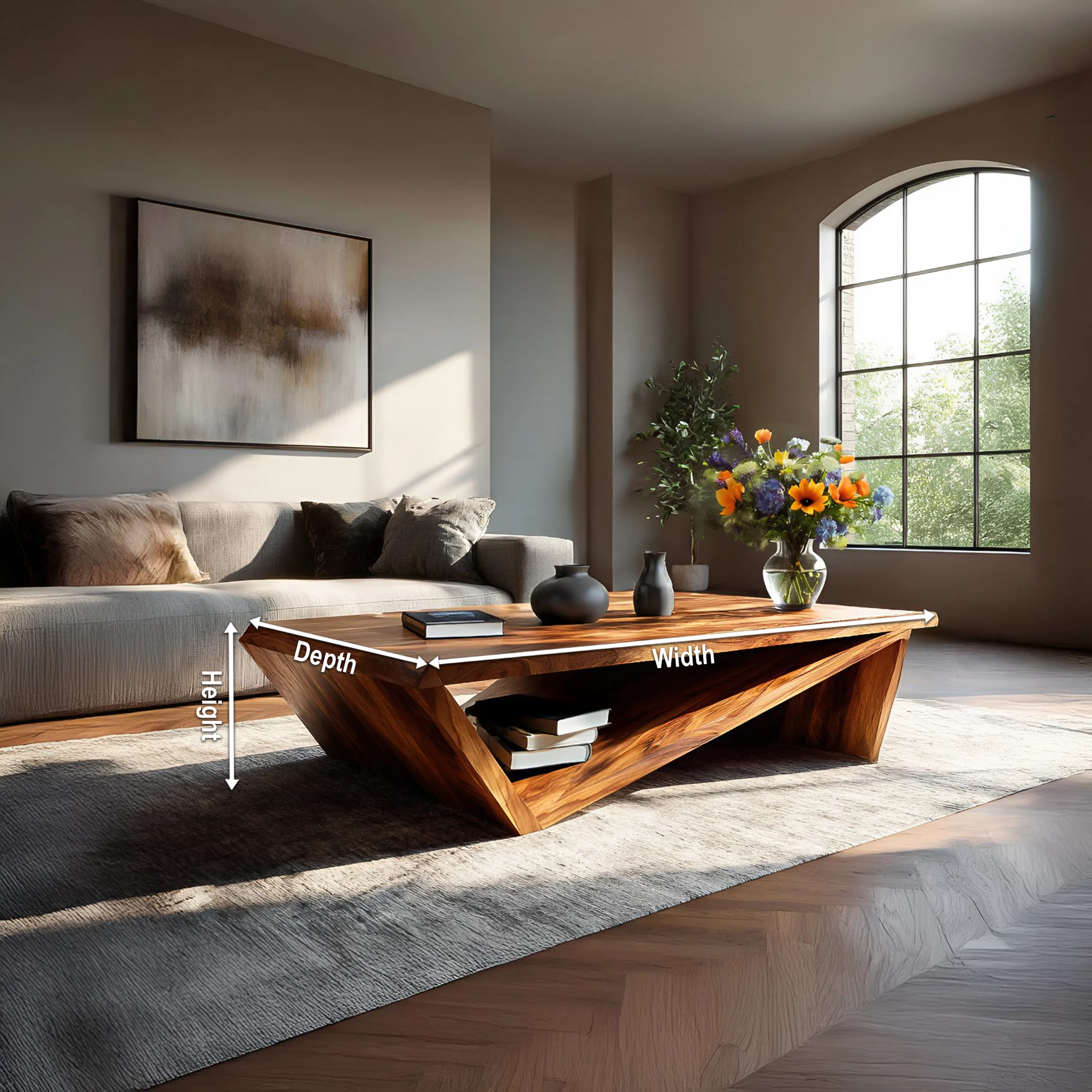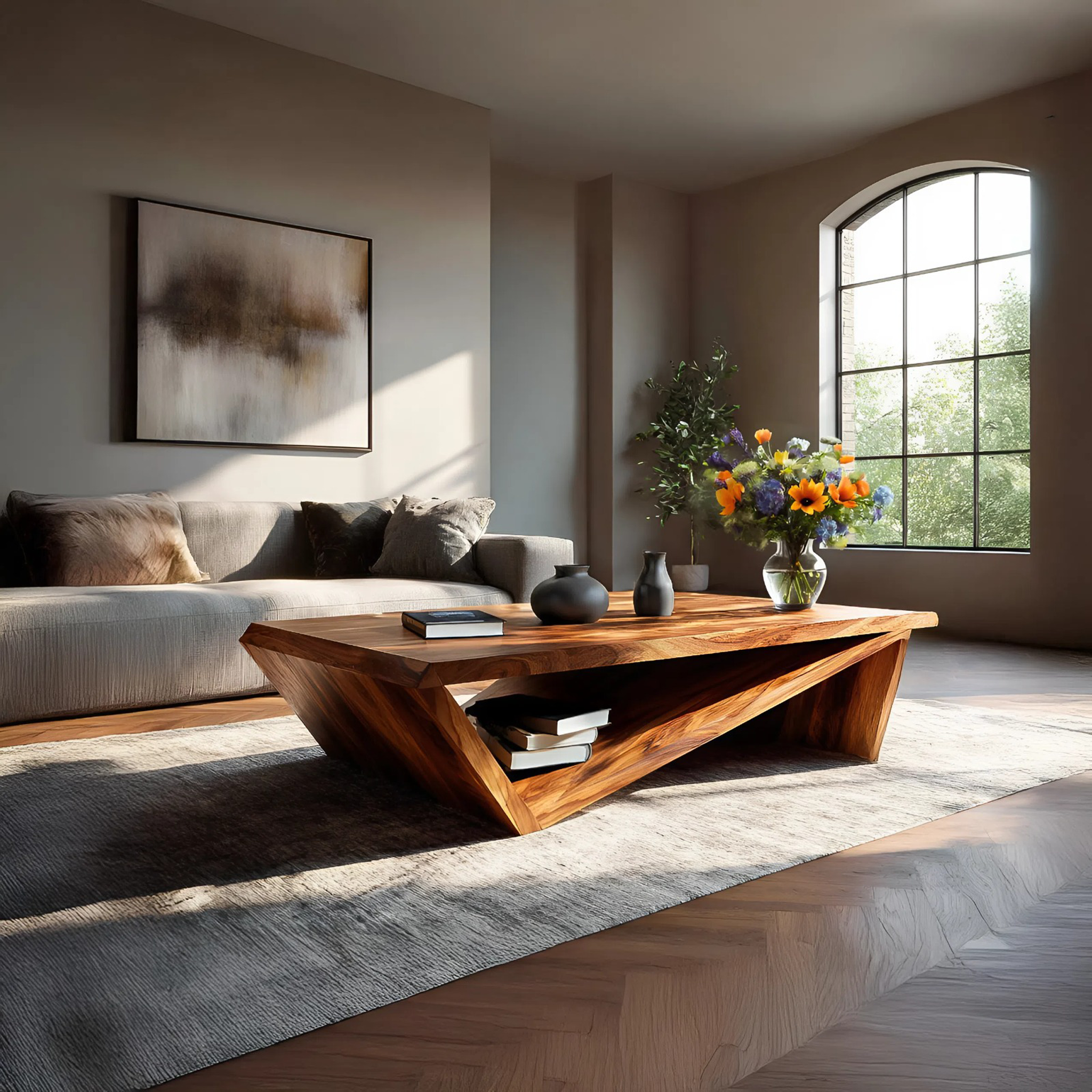 Carefully angled planes establish the Contemporary Handmade Coffee Table For Home Interiors as a sculptural centerpiece shaped by material expression and proportion. The wide tabletop and inward-sloping base reveal flowing natural wood grain from multiple perspectives, creating visual depth while offering practical surface space for everyday living. Its grounded geometry introduces warmth and quiet balance, allowing the table to settle naturally within the room.