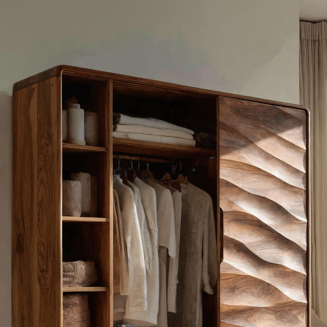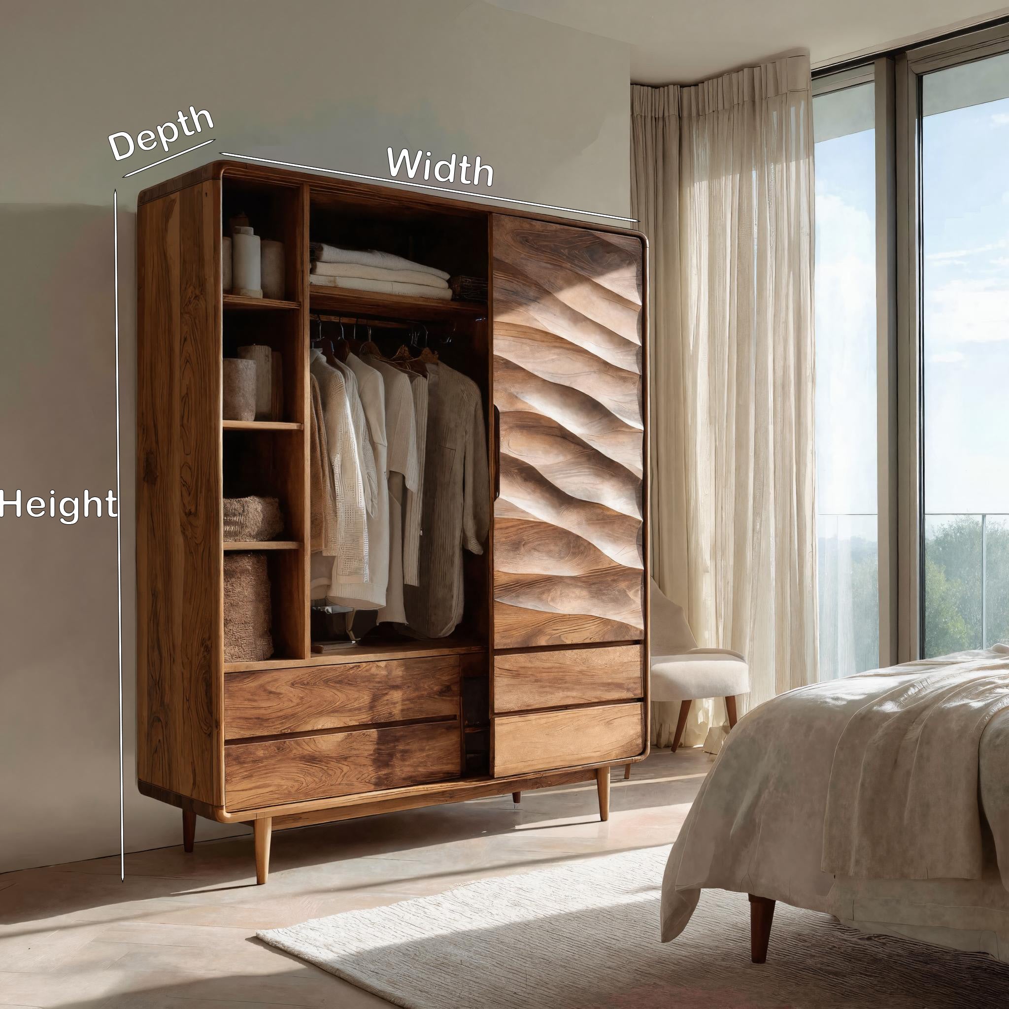 - Versatile Placement: Well suited for bedrooms, dressing areas, or private living spaces, this wardrobe can be placed along a main wall or near windows to enhance the depth of the carved surface. Its upright proportions allow it to function comfortably in both compact and spacious rooms.
