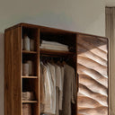 Balanced through subtle carving and an intuitive internal layout, the Contemporary Wardrobe With Drawers And Shelf For Bedroom brings storage and surface expression together in a calm, cohesive form. The wardrobe combines a sculpted sliding door with open shelving, hanging space, and lower drawers, creating a clear visual hierarchy while allowing daily items to remain easily accessible. The flowing door pattern adds gentle movement to the façade, interacting softly with natural light without overpowering the room.