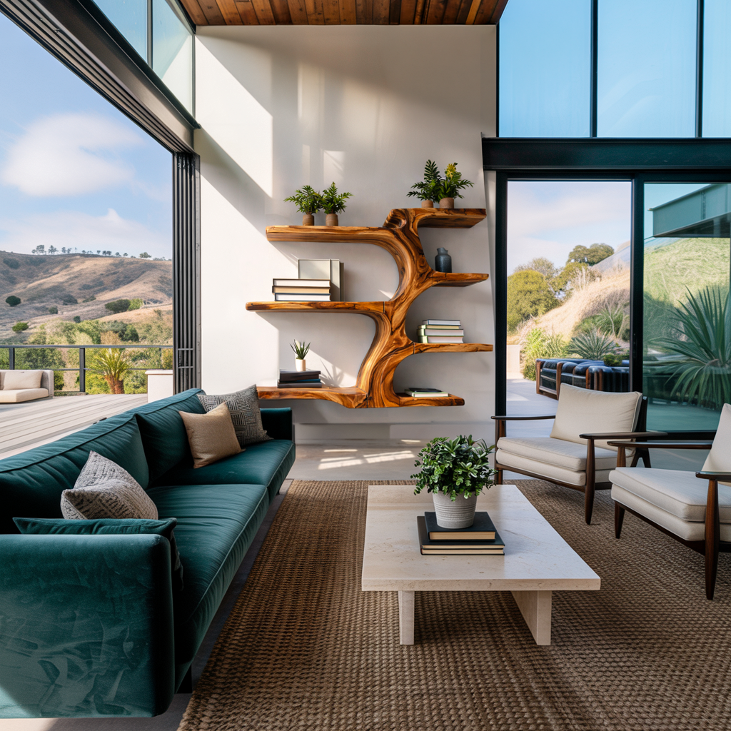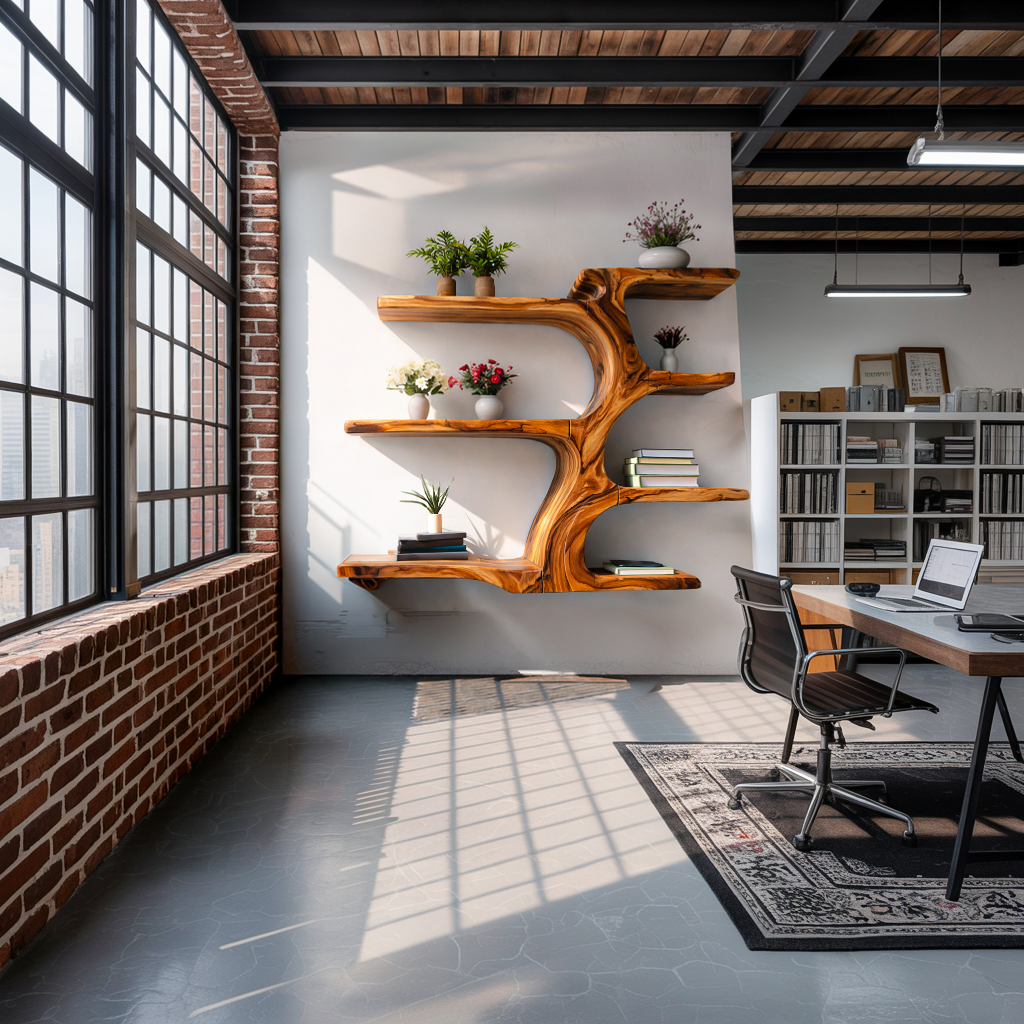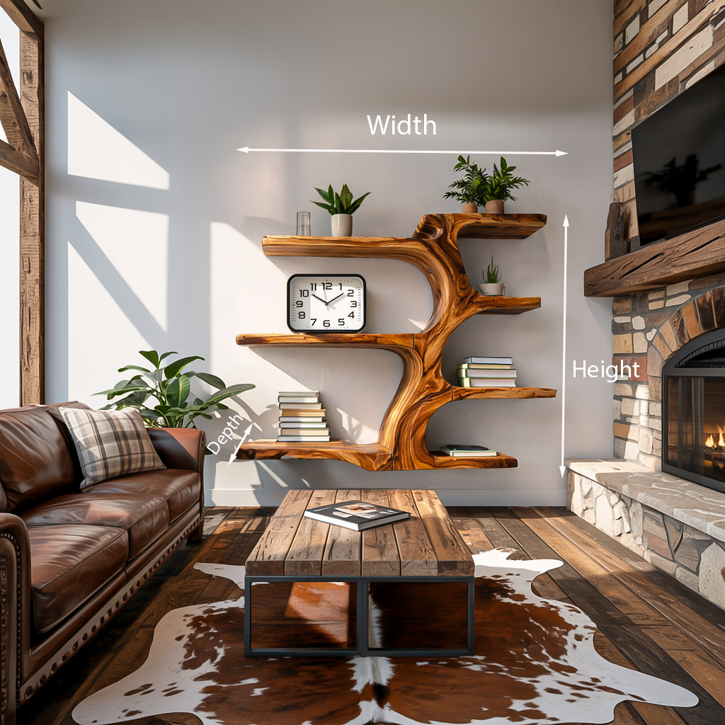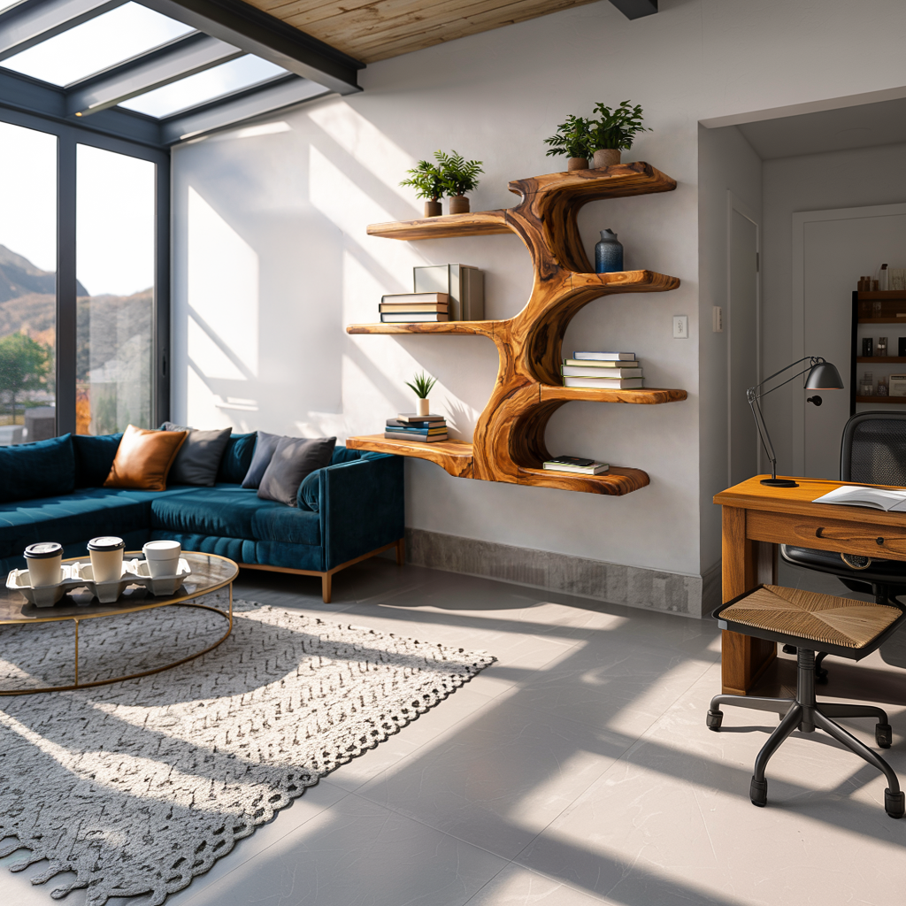 - Functional Benefits: The branch-like shelves provide multiple levels for organizing books, decorative objects, plants, or framed pieces while maintaining a balanced and open display. The flowing central trunk visually connects the shelves, creating natural movement that enhances the wall while turning everyday storage into a decorative feature. Its wall-mounted structure also helps keep the surrounding area spacious and uncluttered.