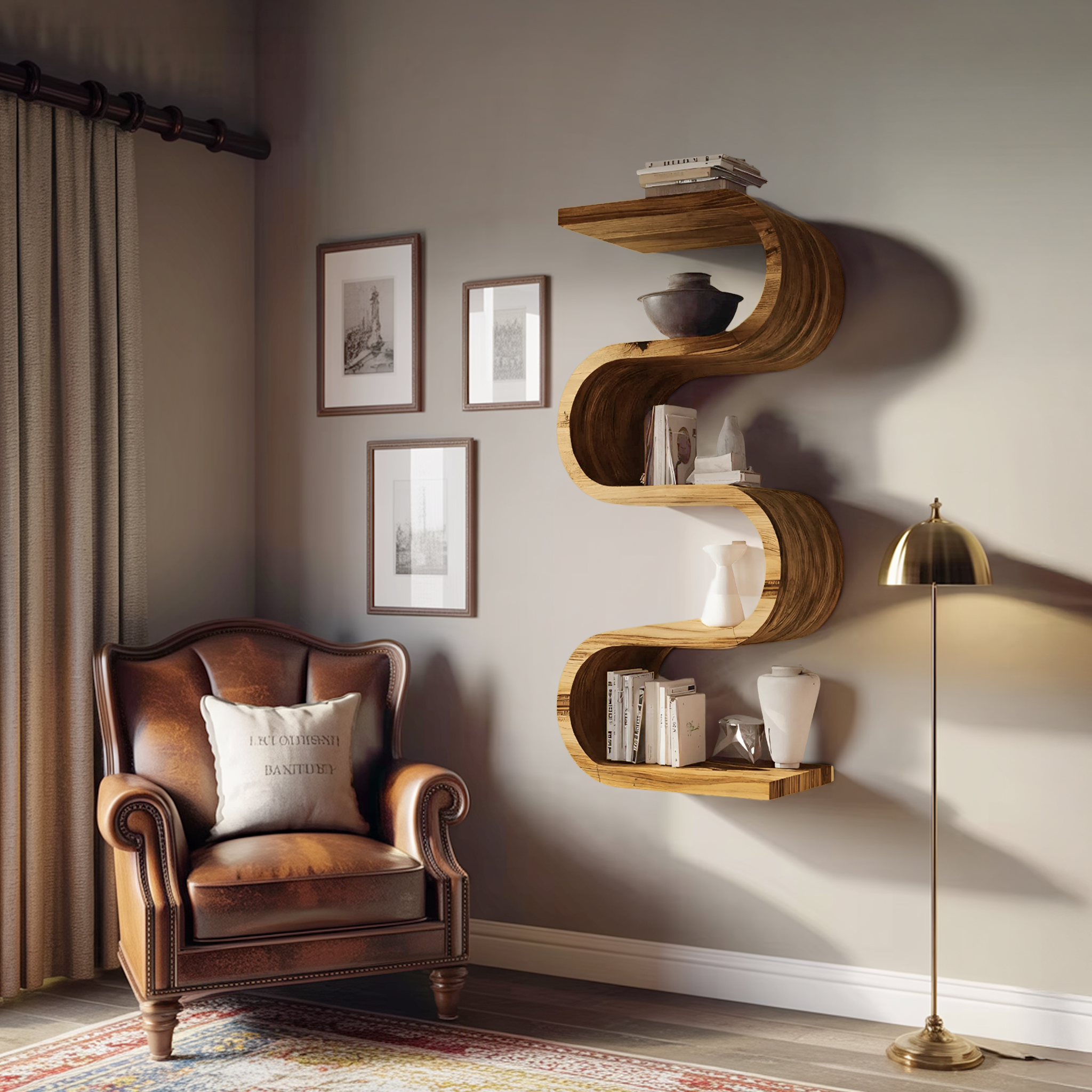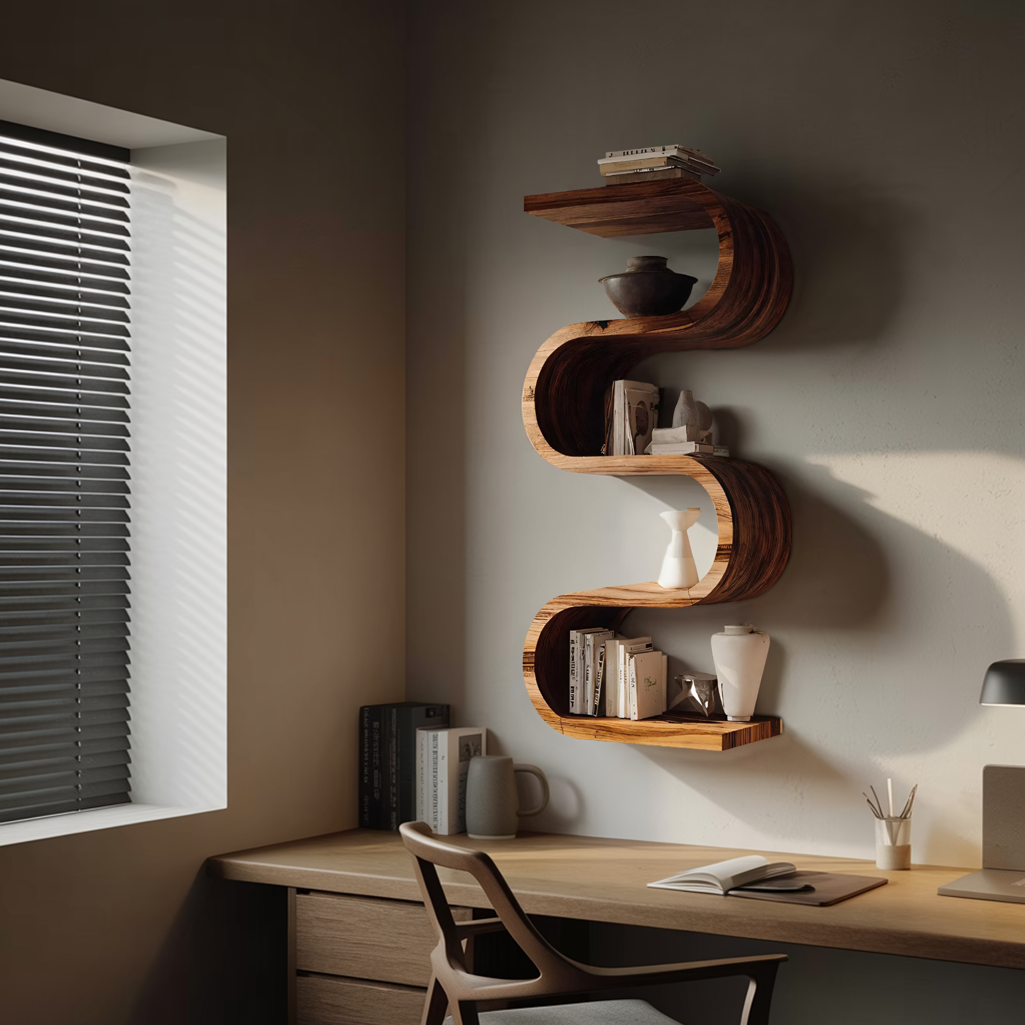 Defined by a flowing vertical silhouette, the Handcrafted Vertical Wall Bookshelf For Living Or Bedroom introduces sculptural movement within a compact footprint. The bookshelf rises along the wall in a soft, continuous curve, blending storage and form into a single architectural element. Its organic rhythm creates visual interest without overwhelming the space, making it feel both functional and artistic.