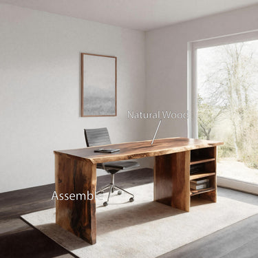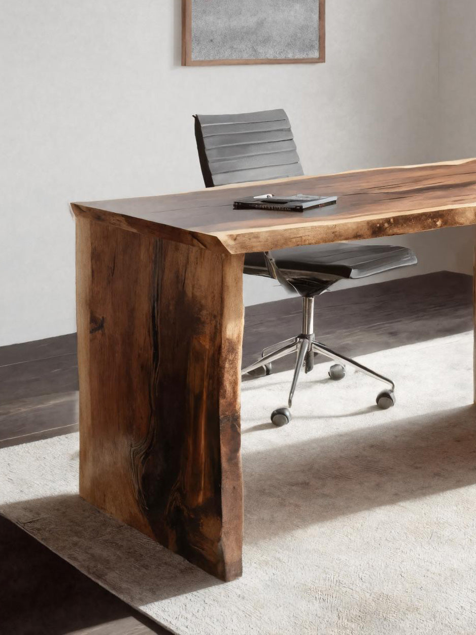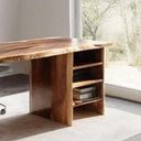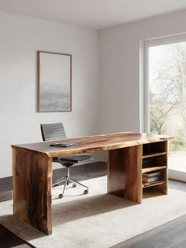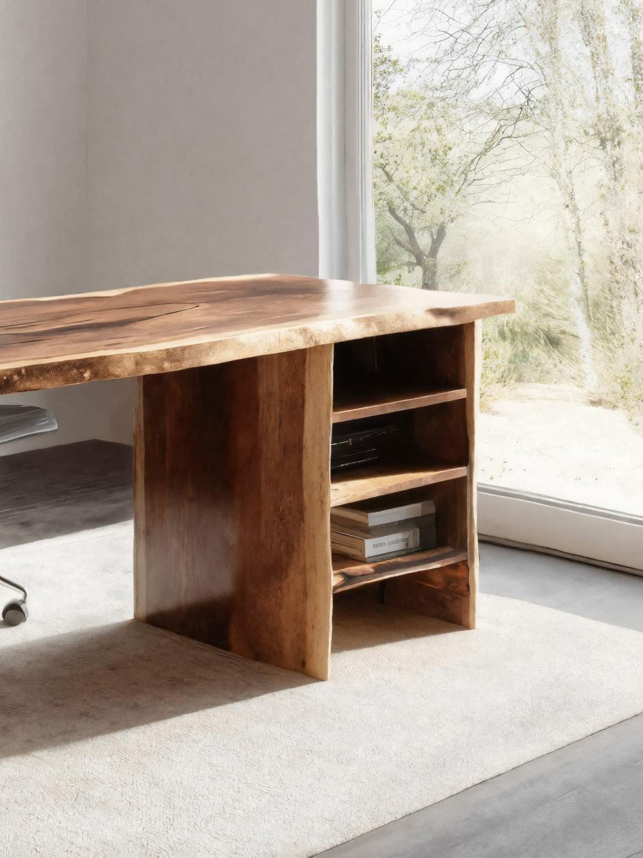This desk features a wide live-edge surface that preserves the natural curves of the wood, adding gentle movement to an otherwise minimal structure. The left panel leg forms a solid architectural base, while the right open shelving unit provides practical storage without disrupting the clean lines. The design offers a balanced blend of workspace utility and organic character.