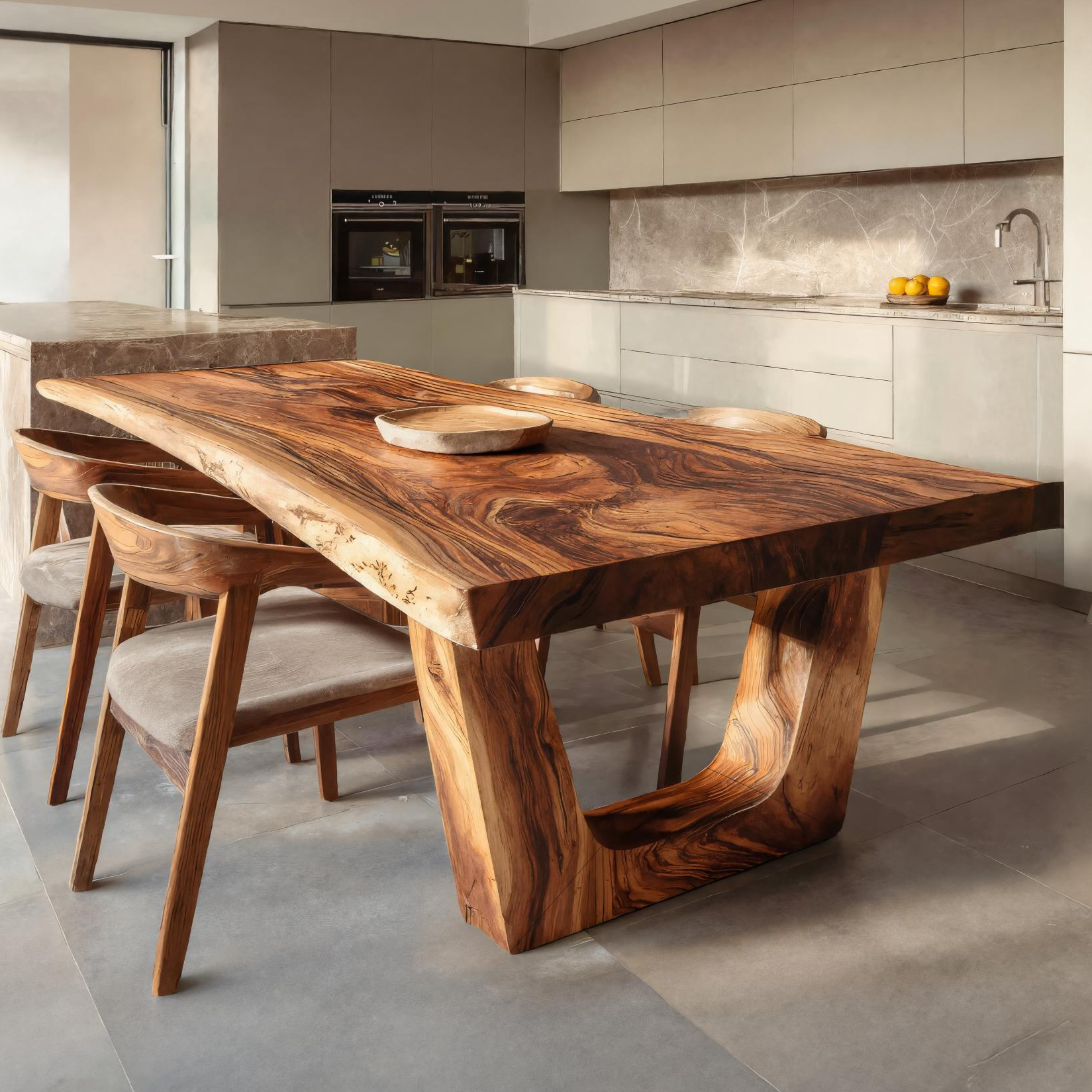 Defined by restraint and clarity, the Minimalist Dining Table With Sleek Look For Dining Room introduces a calm, architectural presence into the space. The clean tabletop silhouette is supported by a sculptural solid-wood base, creating a refined balance between visual simplicity and natural richness. Subtle curves and continuous wood grain soften the geometry, allowing the table to feel warm, intentional, and quietly expressive.
