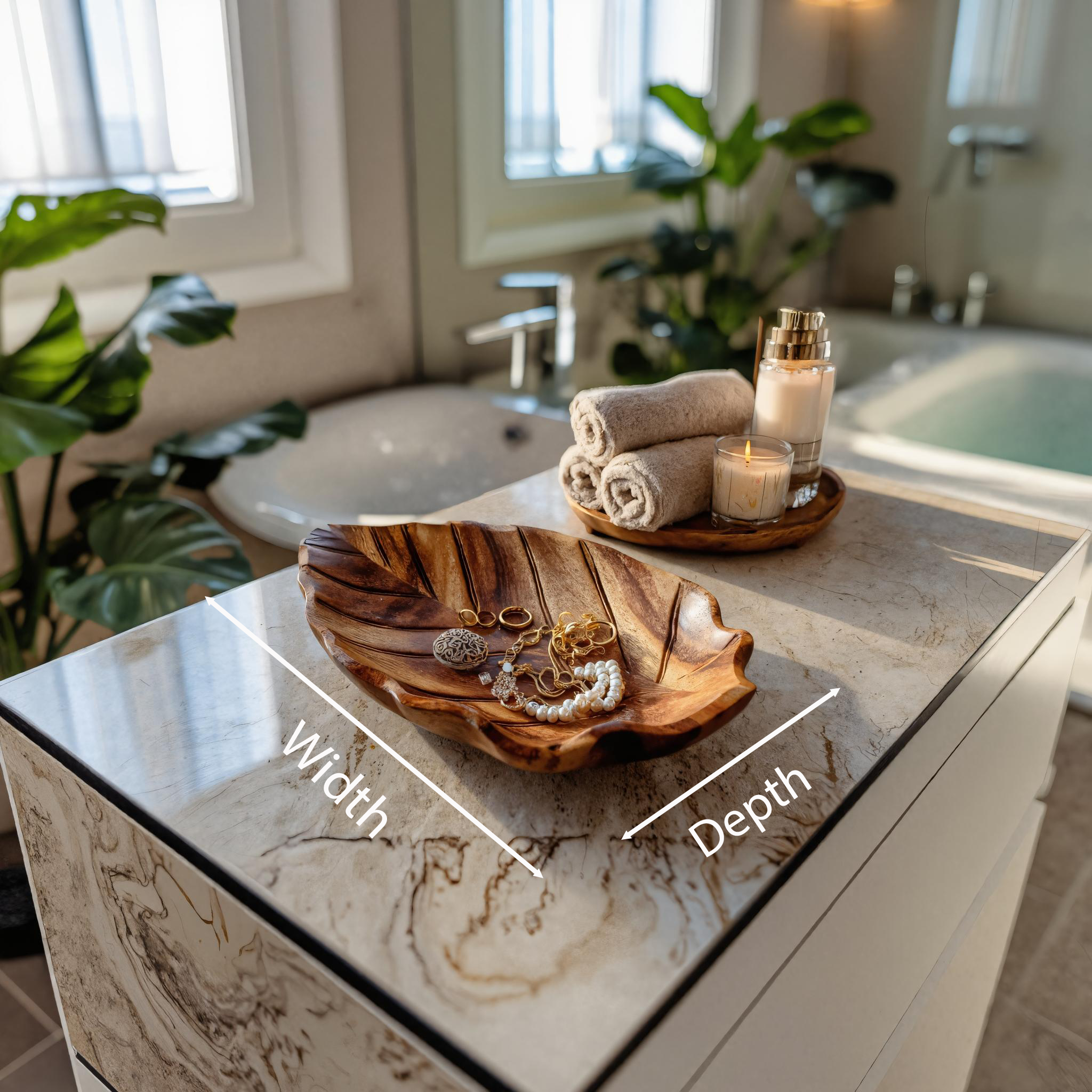 - Versatile Placement: Perfect for display on bathroom countertops, vanity tables, bedside surfaces, or decorative shelves, this tray integrates seamlessly into luxurious, modern, or nature-inspired interiors. Its elegant leaf profile makes it ideal for showcasing jewelry, perfumes, or everyday accessories.