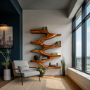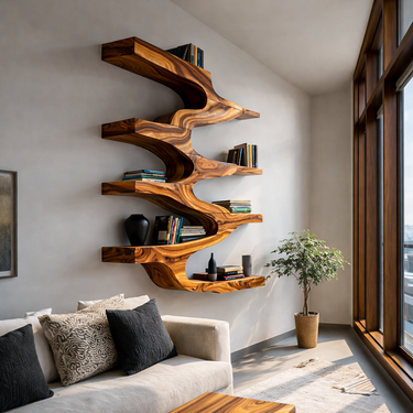 Gently sweeping wood contours frame our Minimalist Wood Floating Bookshelf For Living Space, forming a vertical display that merges storage with sculptural movement. The central flowing structure branches outward into layered shelves, creating a natural rhythm across the wall. Each surface reveals expressive wood grain patterns, allowing books, small sculptures, ceramics, or plants to rest within a composition that feels both balanced and visually engaging.