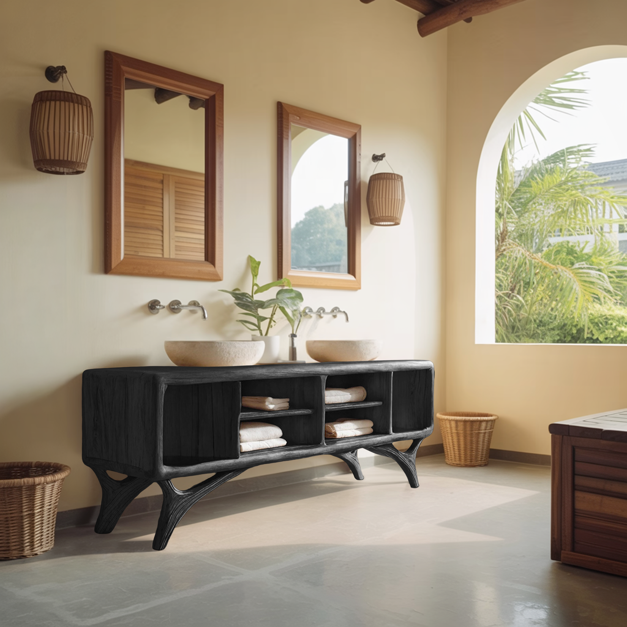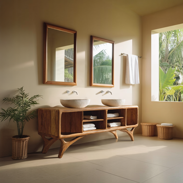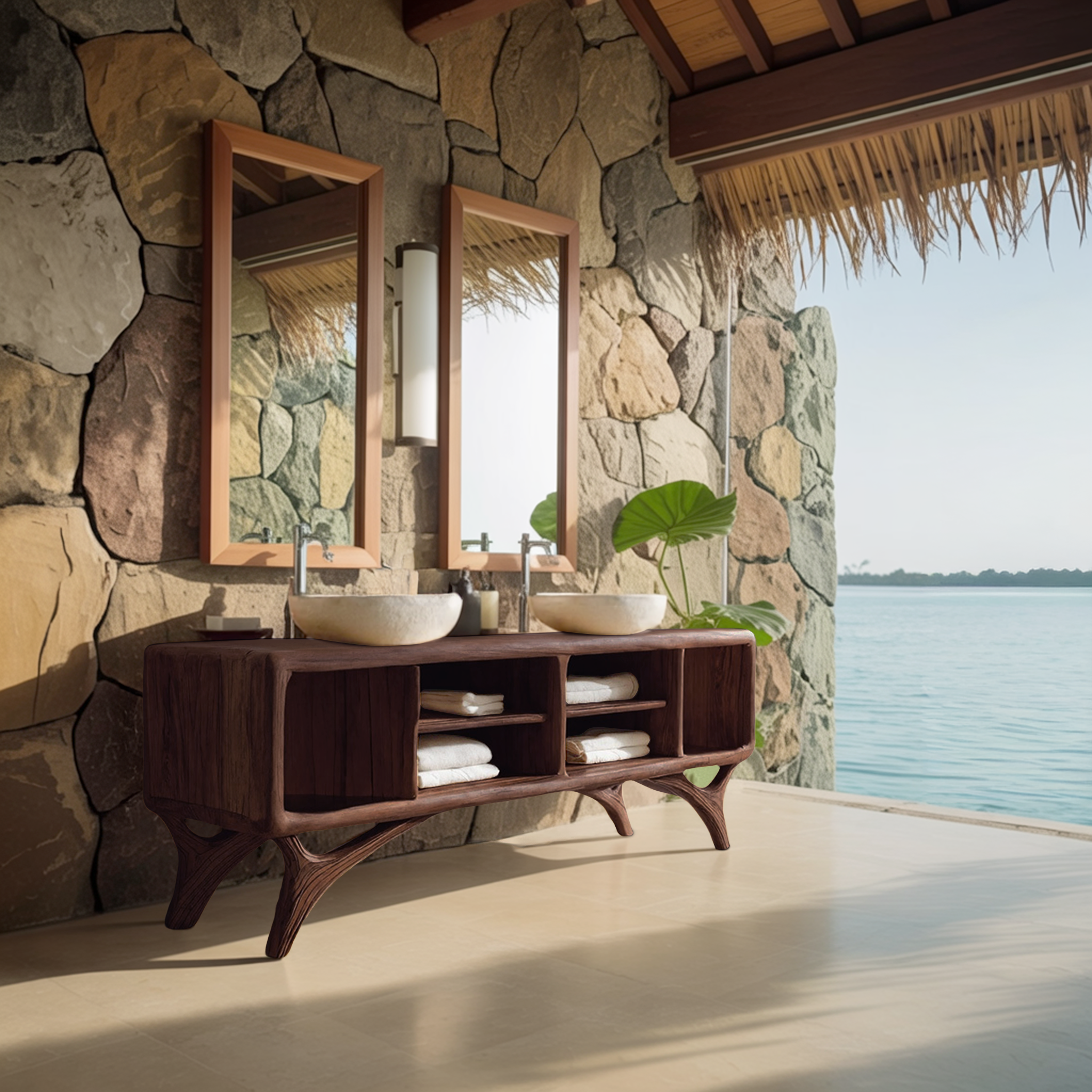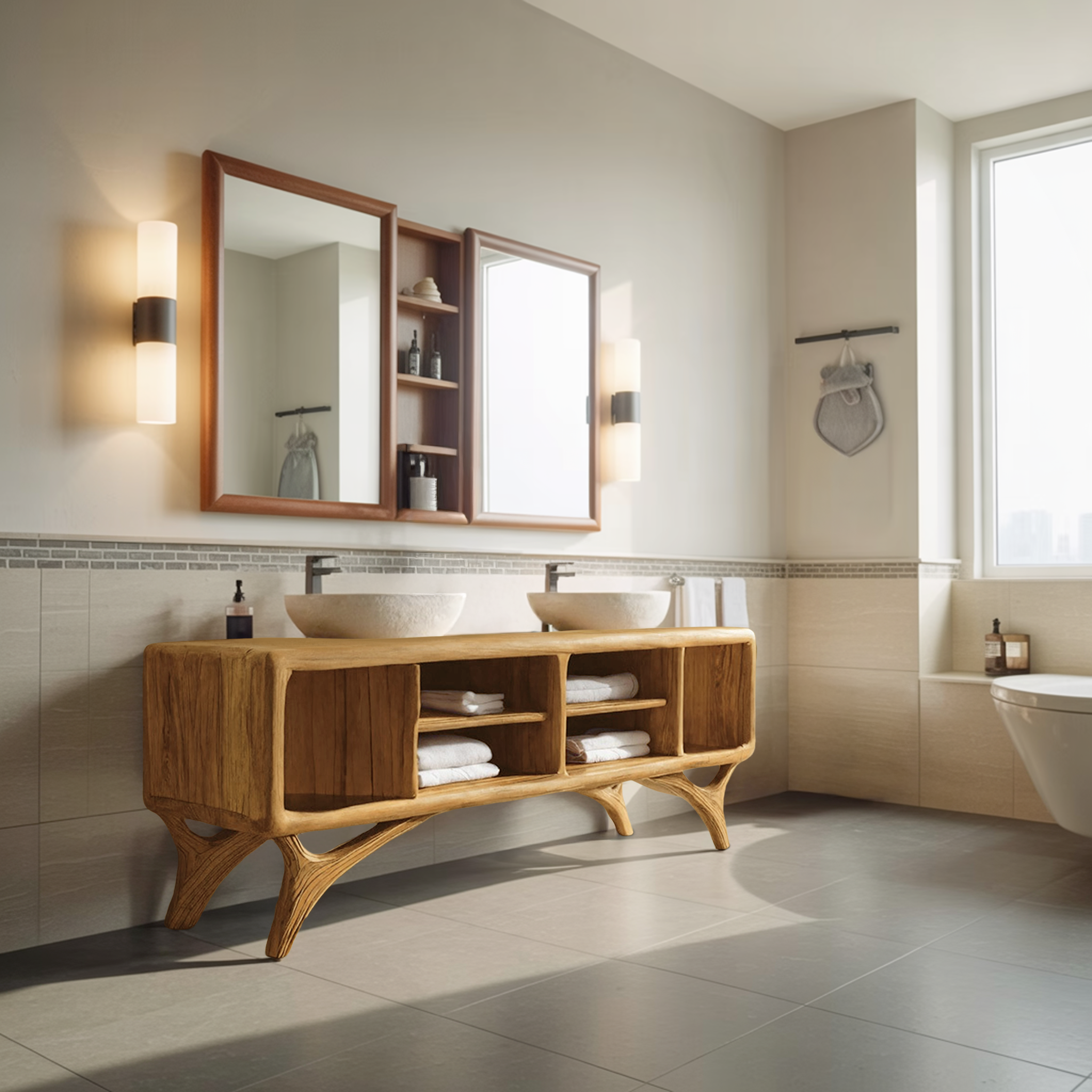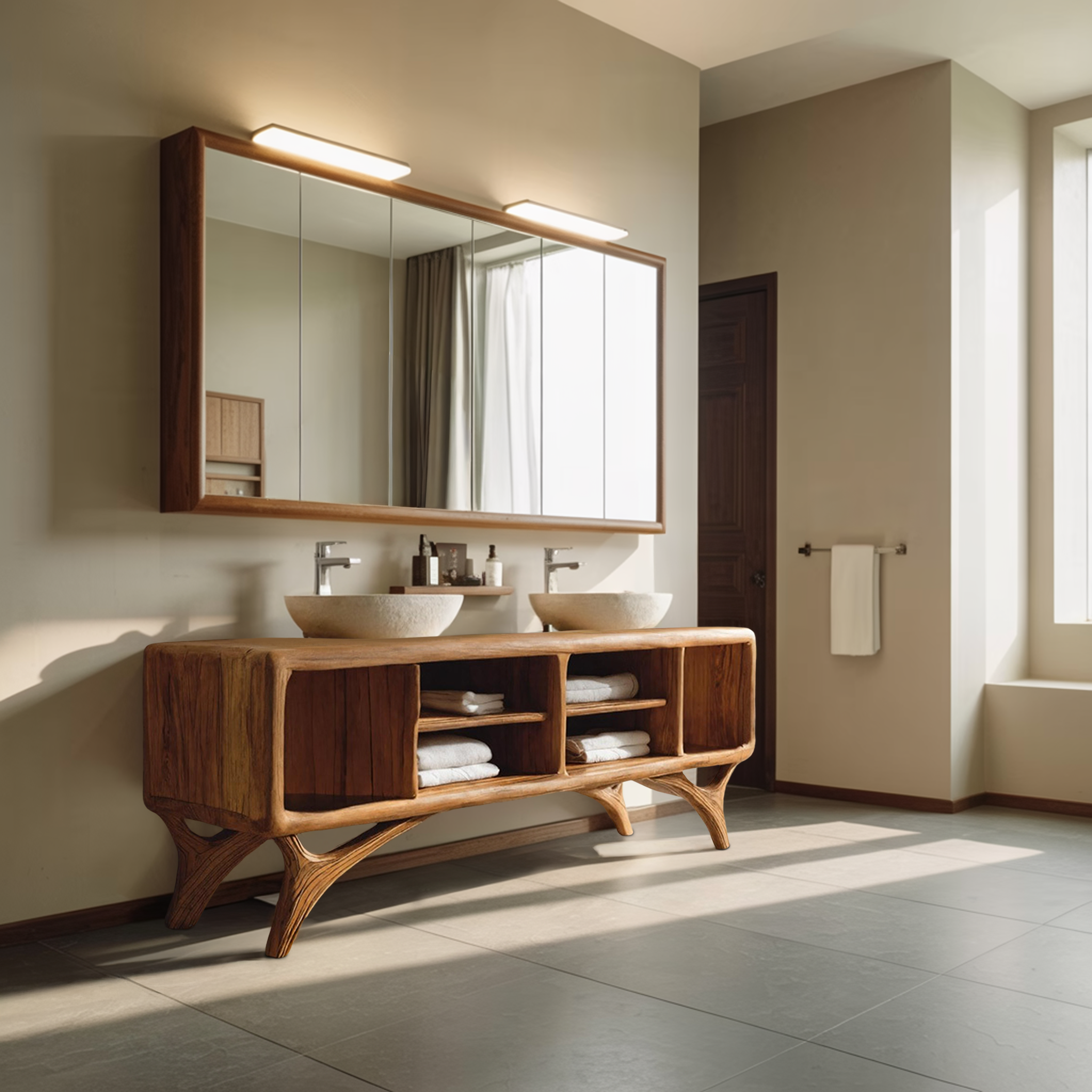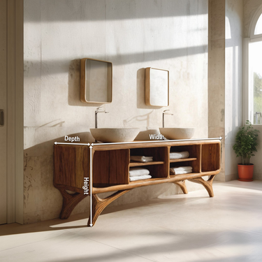 Smooth, rounded volumes and open compartments give Modern Bathroom Vanity Cabinet For Bathroom Decor a grounded yet visually light presence along the wall. The gently curved body softens the overall silhouette, while the open shelving creates a sense of openness beneath the countertop. Paired with vessel sinks and wall-mounted mirrors, the cabinet introduces a balanced composition where natural wood surfaces and everyday function coexist with ease.
