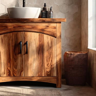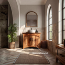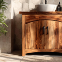 Soft architectural lines highlight the Modern Bathroom Vanity Cabinet For Bathroom Space as a grounded element within the room. The freestanding wooden form draws attention through its expressive grain patterns and gently contoured cabinet doors, creating a sense of visual flow without overwhelming the surrounding space. Topped with a vessel sink and paired with an arched mirror, the vanity settles naturally into the bathroom layout, offering balance between material presence and open floor area.