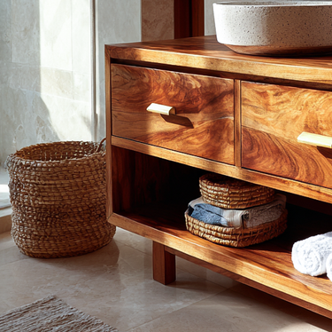 Warm natural tones shape the Modern Bathroom Vanity For Spa Or Bathroom Decor into a grounded and visually engaging element within the bathroom. The solid wood body introduces depth through expressive grain movement, while the structured form keeps the overall presence calm and composed. Positioned beneath a vessel sink, the vanity creates a balanced surface that supports everyday routines while adding material richness to the space.