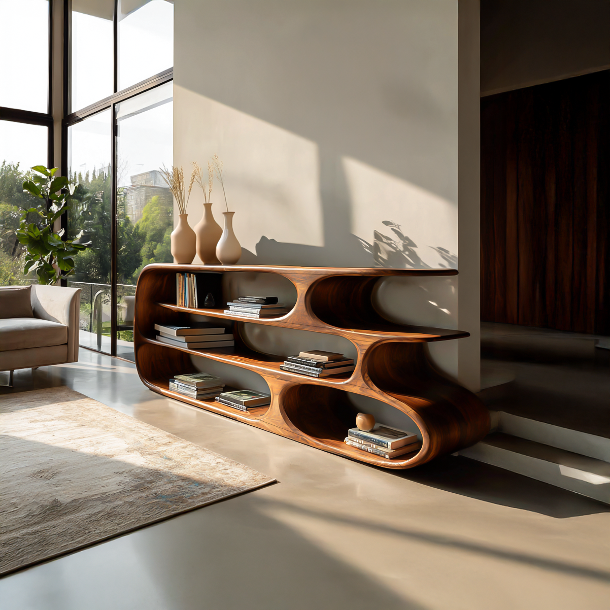 Modern Bookshelf With Sculptural Curves For Living Room Interior