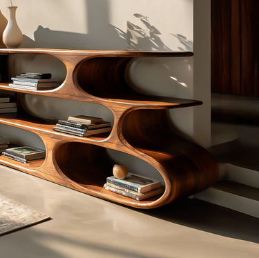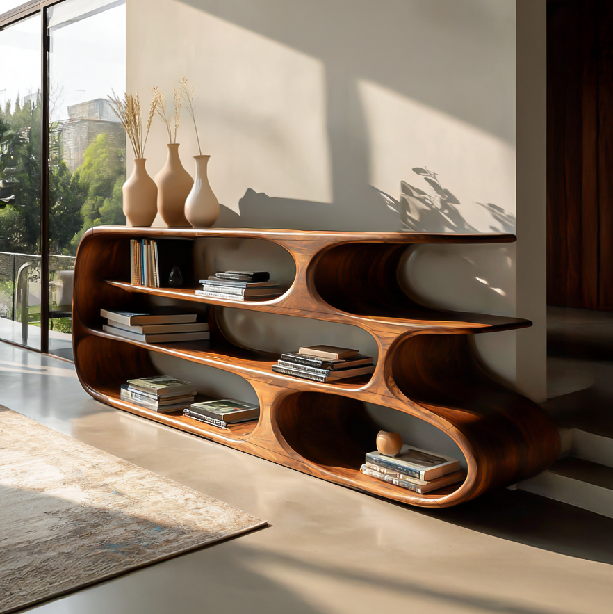 Elevate your interior with the bold elegance of the Modern Bookshelf With Sculptural Curves For Living Room Interior. Designed with fluid, continuous lines and organically shaped compartments, this statement piece blends art and function seamlessly. The smooth, rounded openings and elongated silhouette highlight the natural depth of the wood grain, creating a warm and sophisticated focal point in contemporary spaces.
