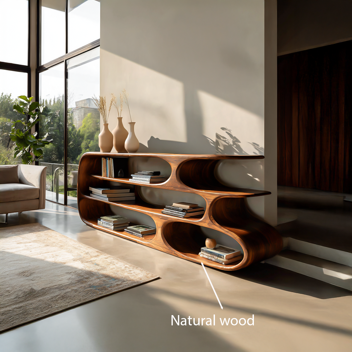 - Materials & Craftsmanship: Made from solid natural wood with expressive, flowing grain, the hand-shaped curved structure features smooth, refined edges. It is purposefully sanded and finished to highlight natural color variations with an eco-friendly protective oil finish for warmth and durability, and crafted using strong joinery techniques for long-lasting stability.
