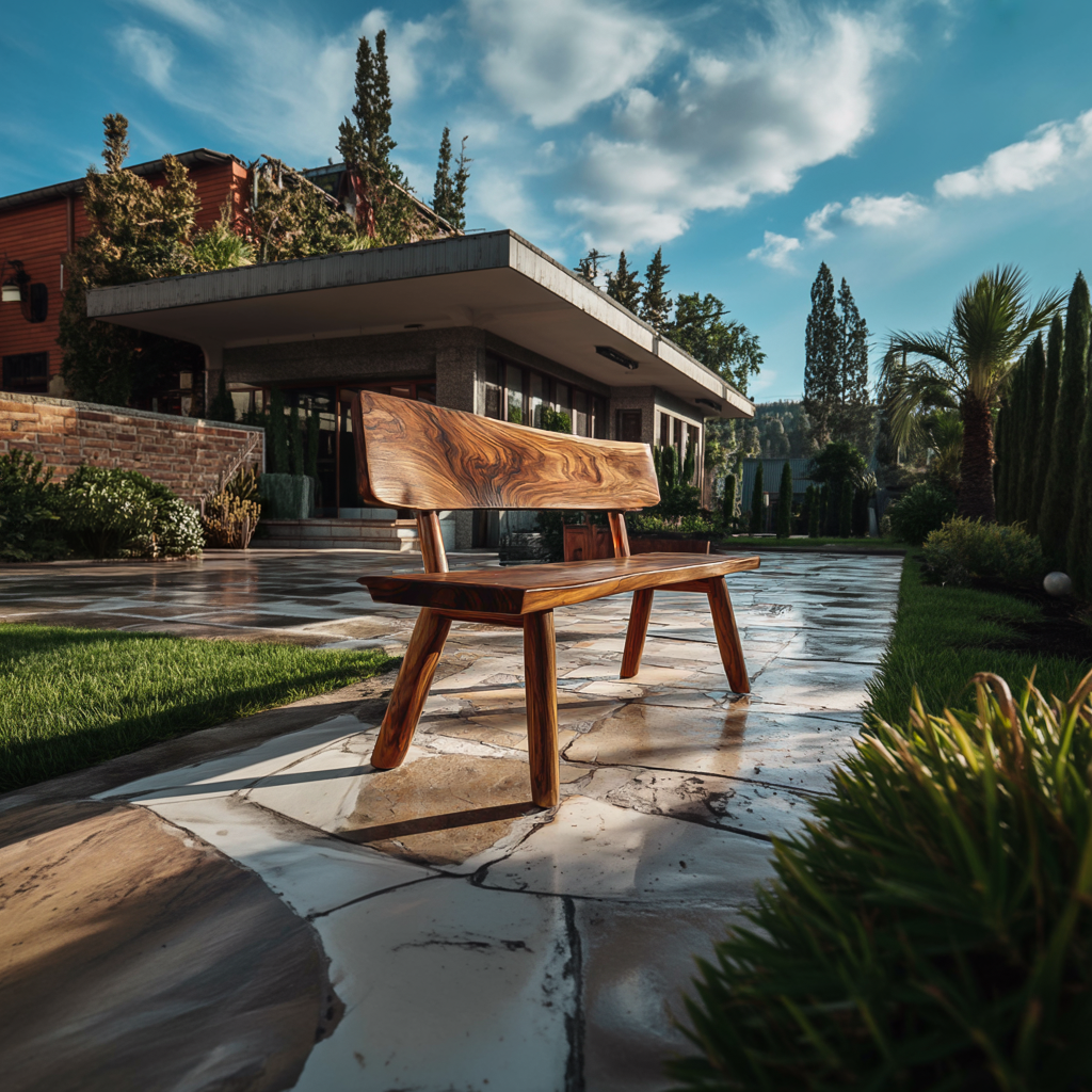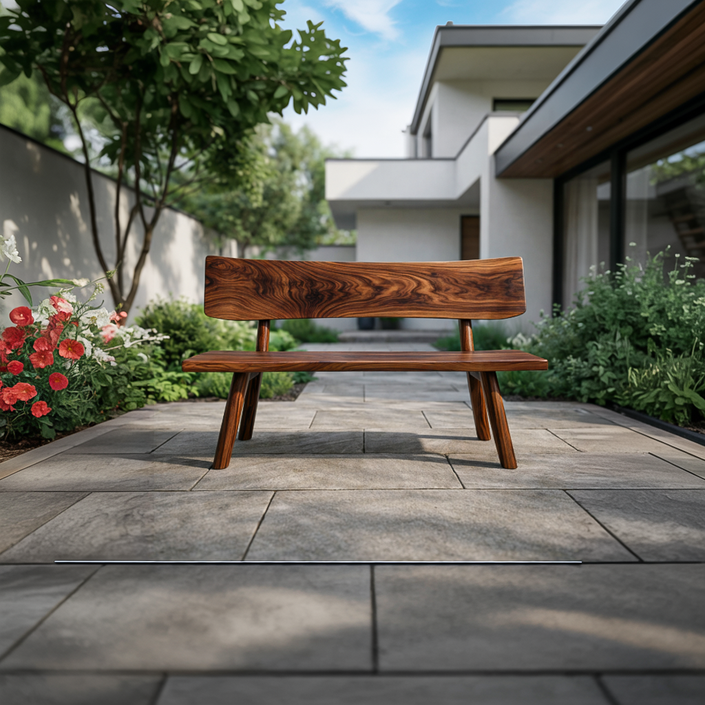 Sculptural wooden contours highlight Modern Outdoor Wood Bench For Landscape Design, creating a refined seating element that blends naturally with outdoor architecture and greenery. Flowing natural contours reveal the expressive grain patterns of natural wood, giving the bench a dynamic visual character while maintaining a calm and balanced form. The gently curved backrest and clean-lined seat form an elegant profile that complements patios, garden pathways, and landscaped surroundings, allowing the bench to function as both seating and a subtle outdoor focal point.
