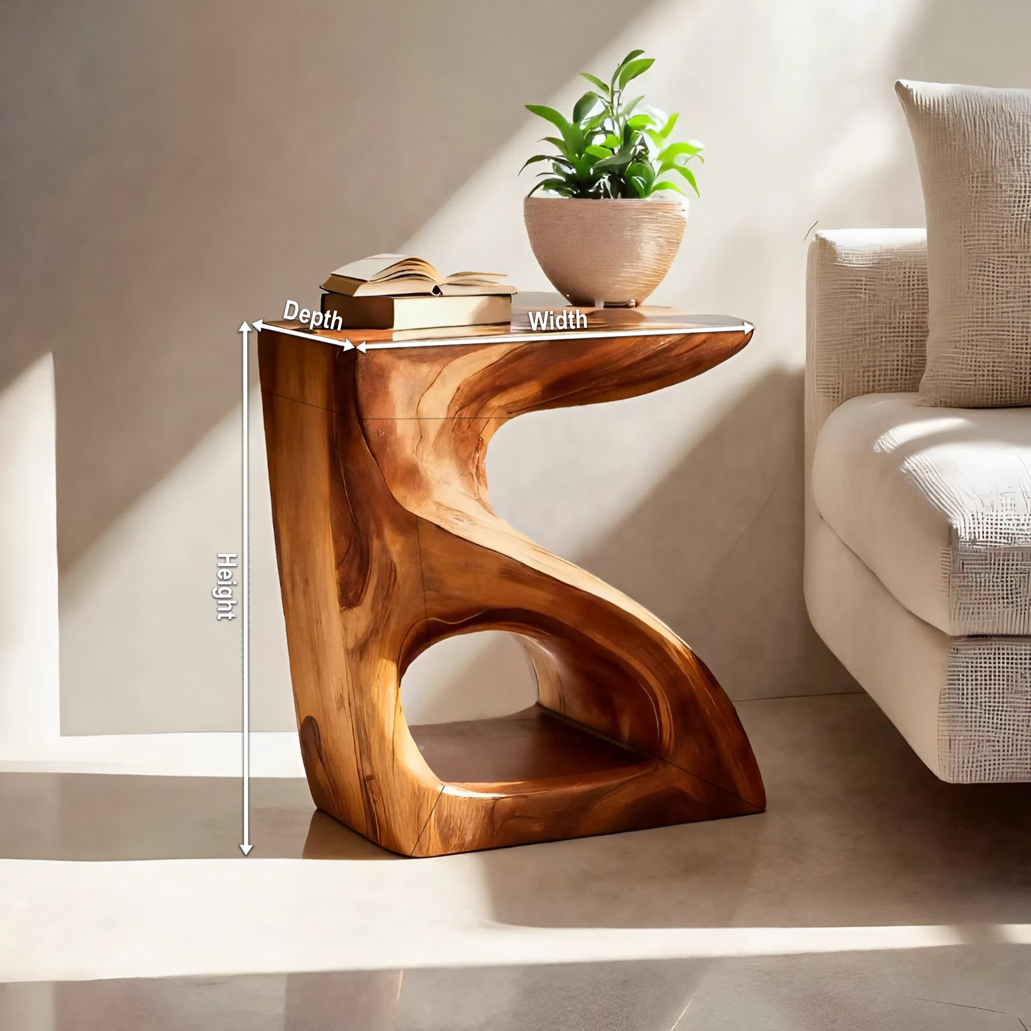 Softly carved wood volumes and flowing negative space define Modern Sculptural Side Table For Home Decor, presenting a compact piece that balances everyday surface use with visual interest. The solid wood form curves upward into a smooth tabletop, while the hollowed base creates an open lower section that allows light and shadow to pass naturally through the structure. This sculpted composition supports practical use while adding a sense of movement to living spaces.