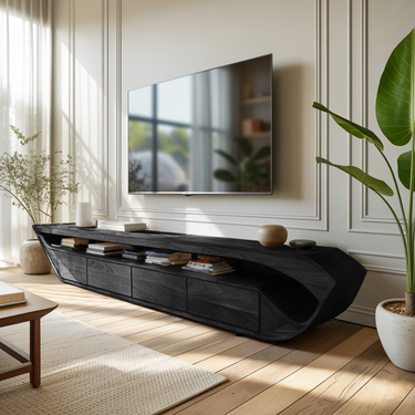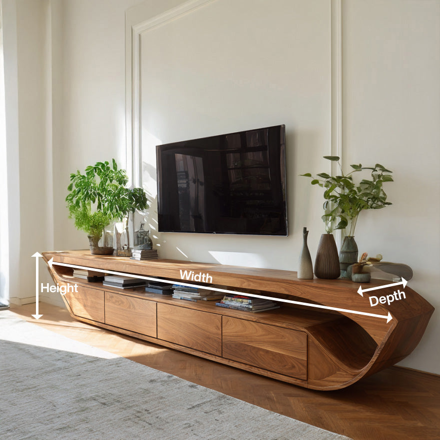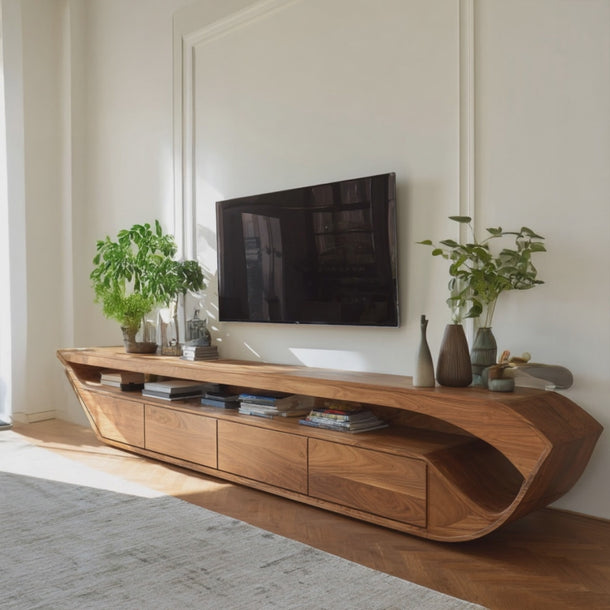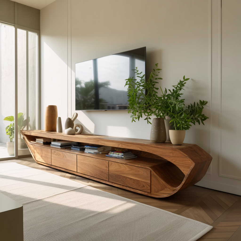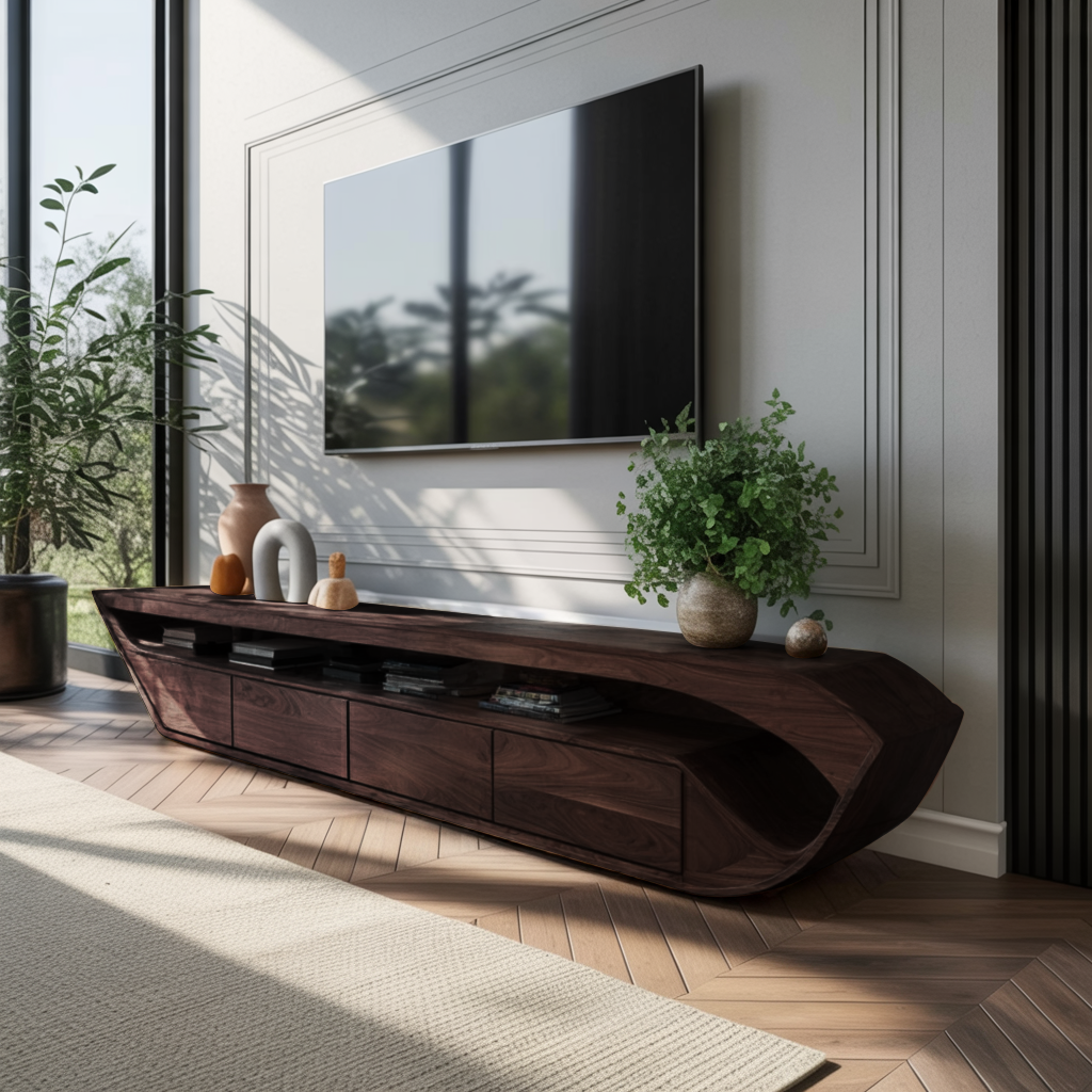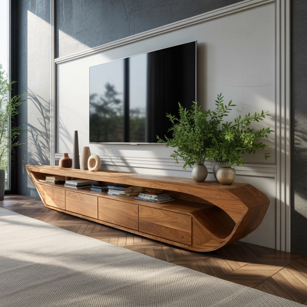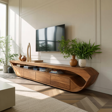 Elevate your interior with the Modern Sculptural TV Console With Drawer For Living Room, a media console shaped to introduce visual flow and spatial balance. The softly contoured frame and measured proportions allow the piece to sit naturally within the room, creating a calm focal presence without disrupting surrounding elements.