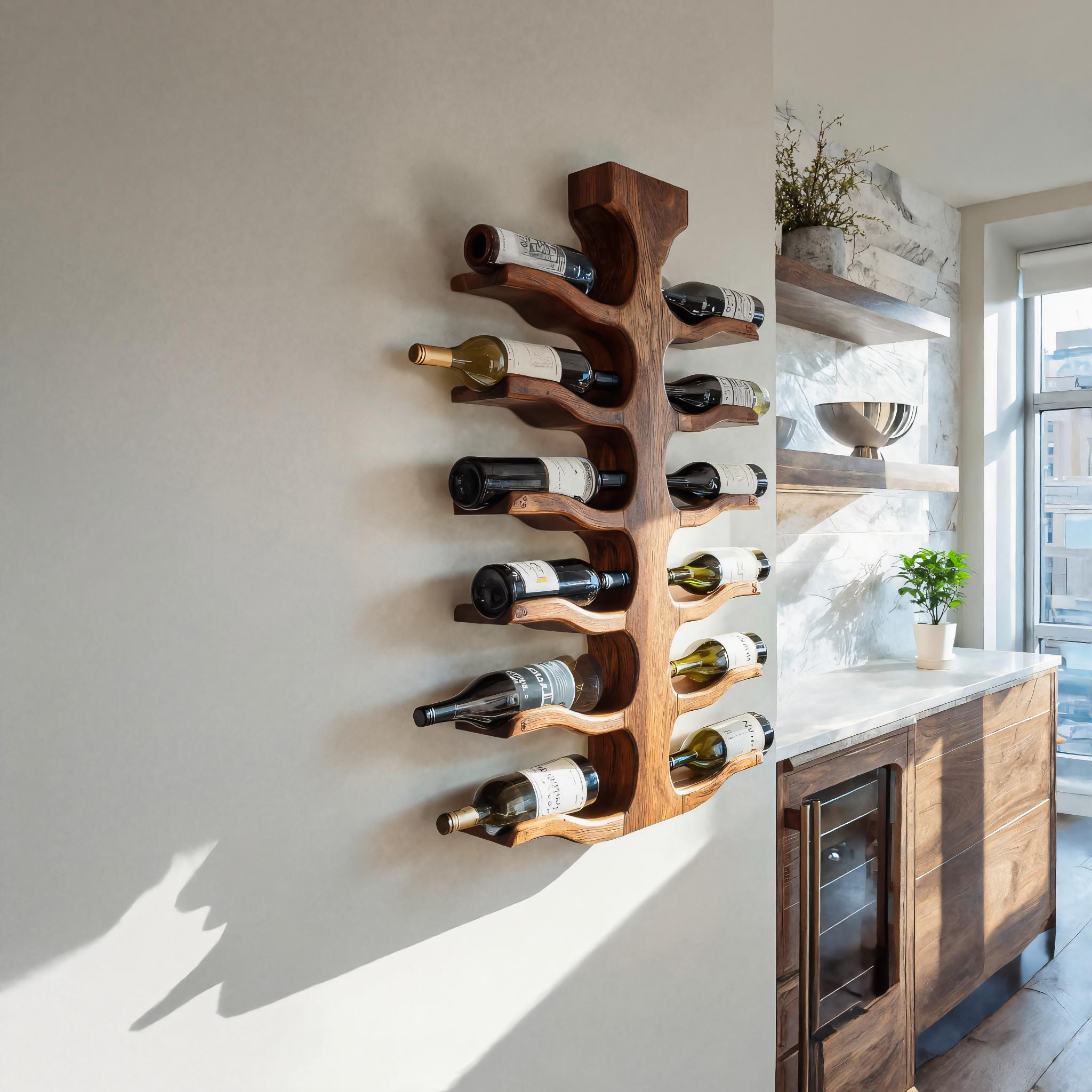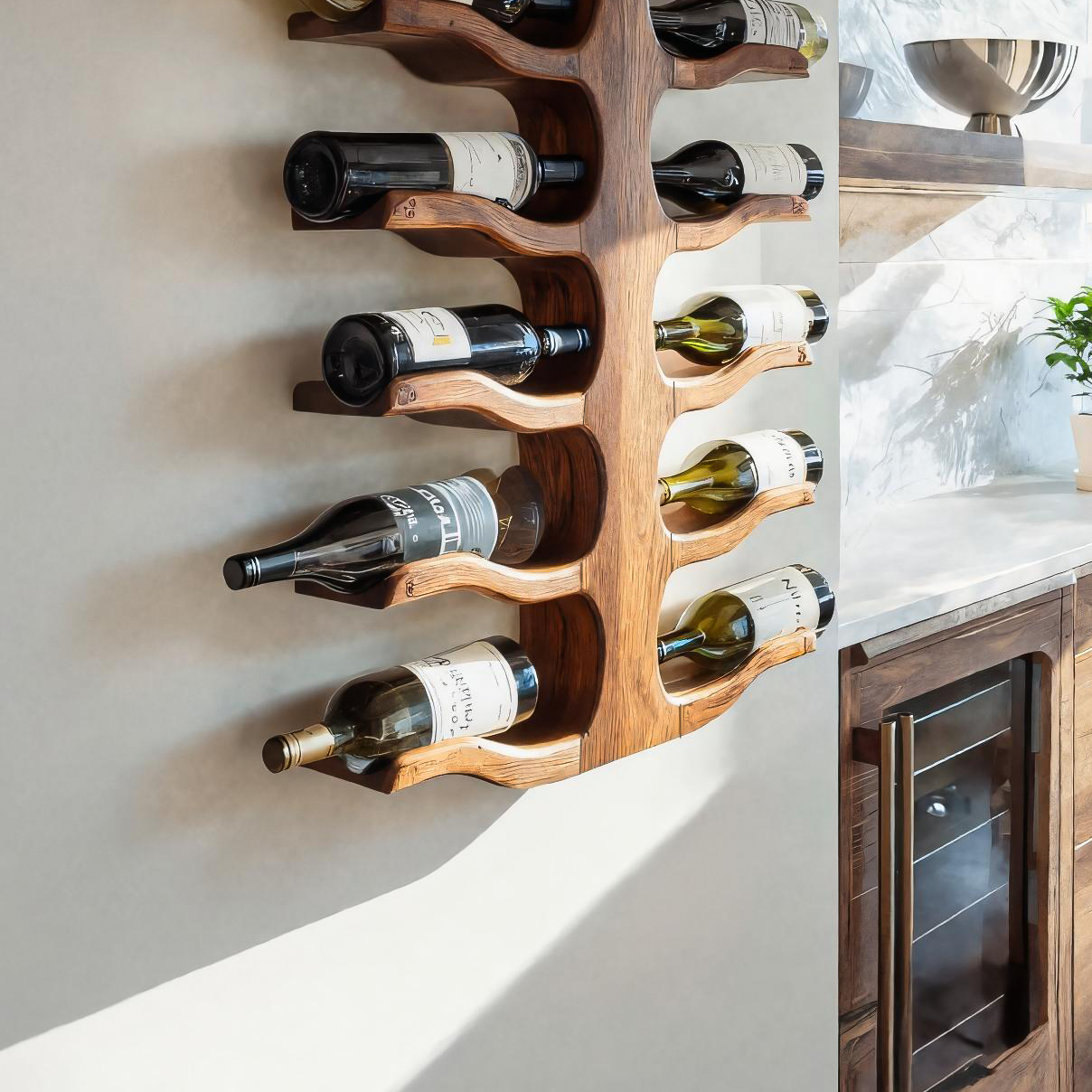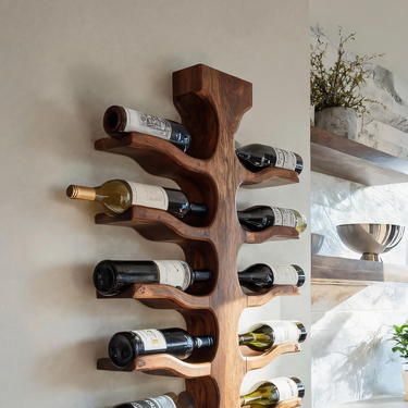 Balanced vertical lines shape the Modern Wall Mounted Wine Rack For Bar Storage Decor, allowing wine bottles to appear as part of the wall rather than simply stored against it. The sculpted wooden spine branches outward with gently contoured supports, holding each bottle in a horizontal position while creating a sense of movement and natural flow. The warm wood grain contrasts softly with the surrounding surfaces, turning everyday wine storage into a visually engaging wall feature.