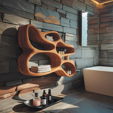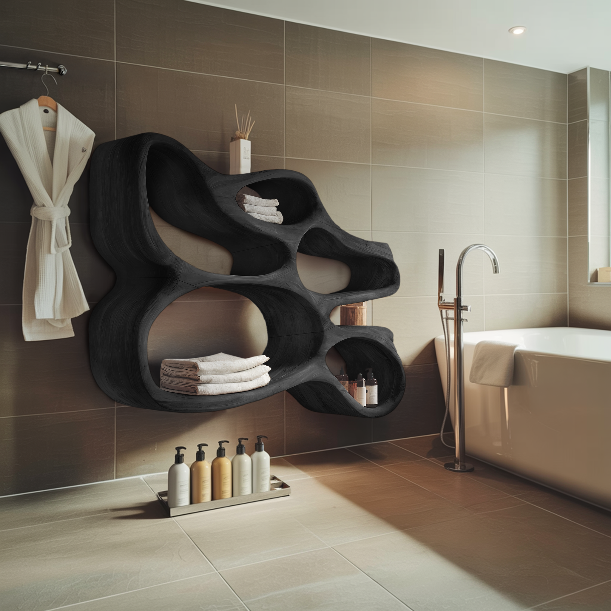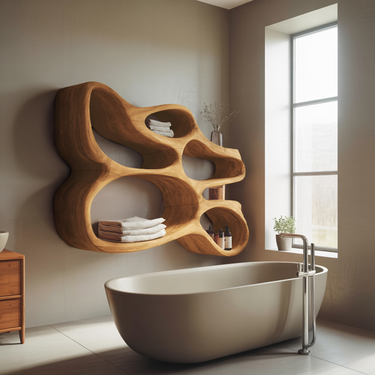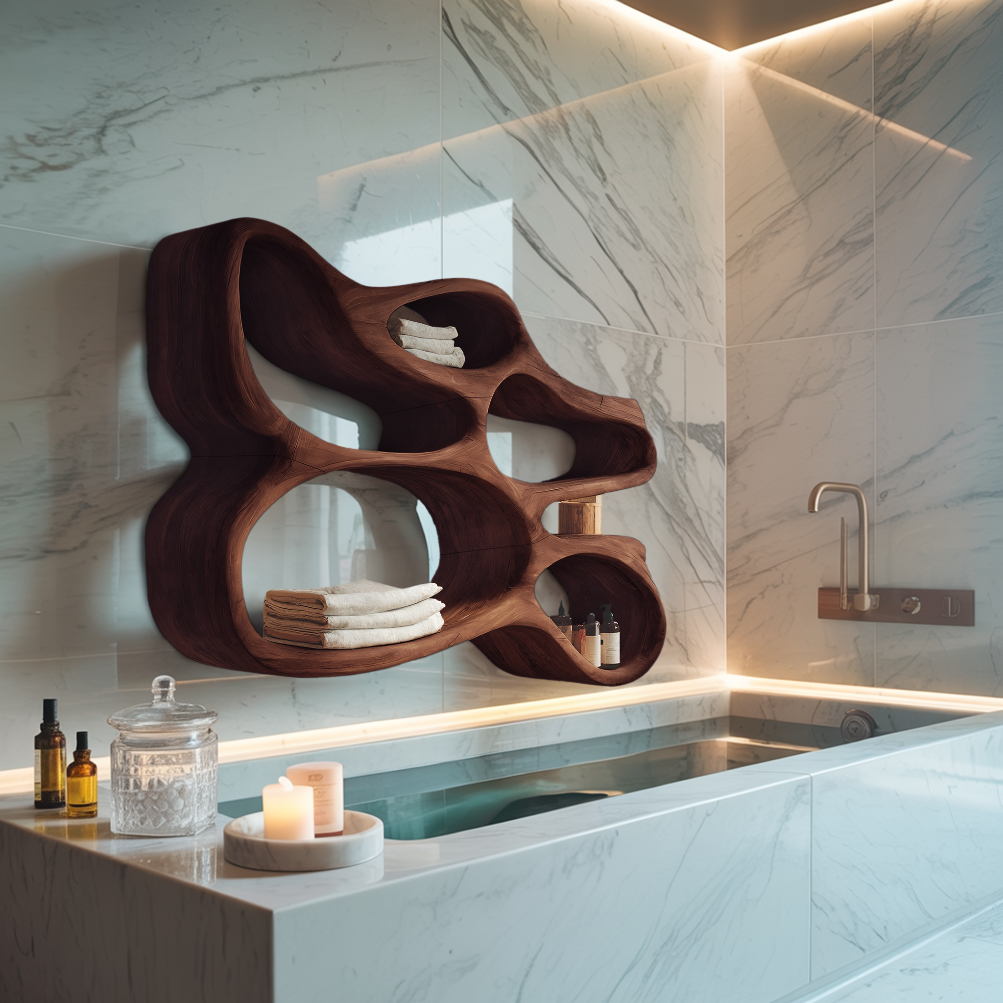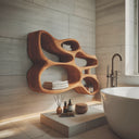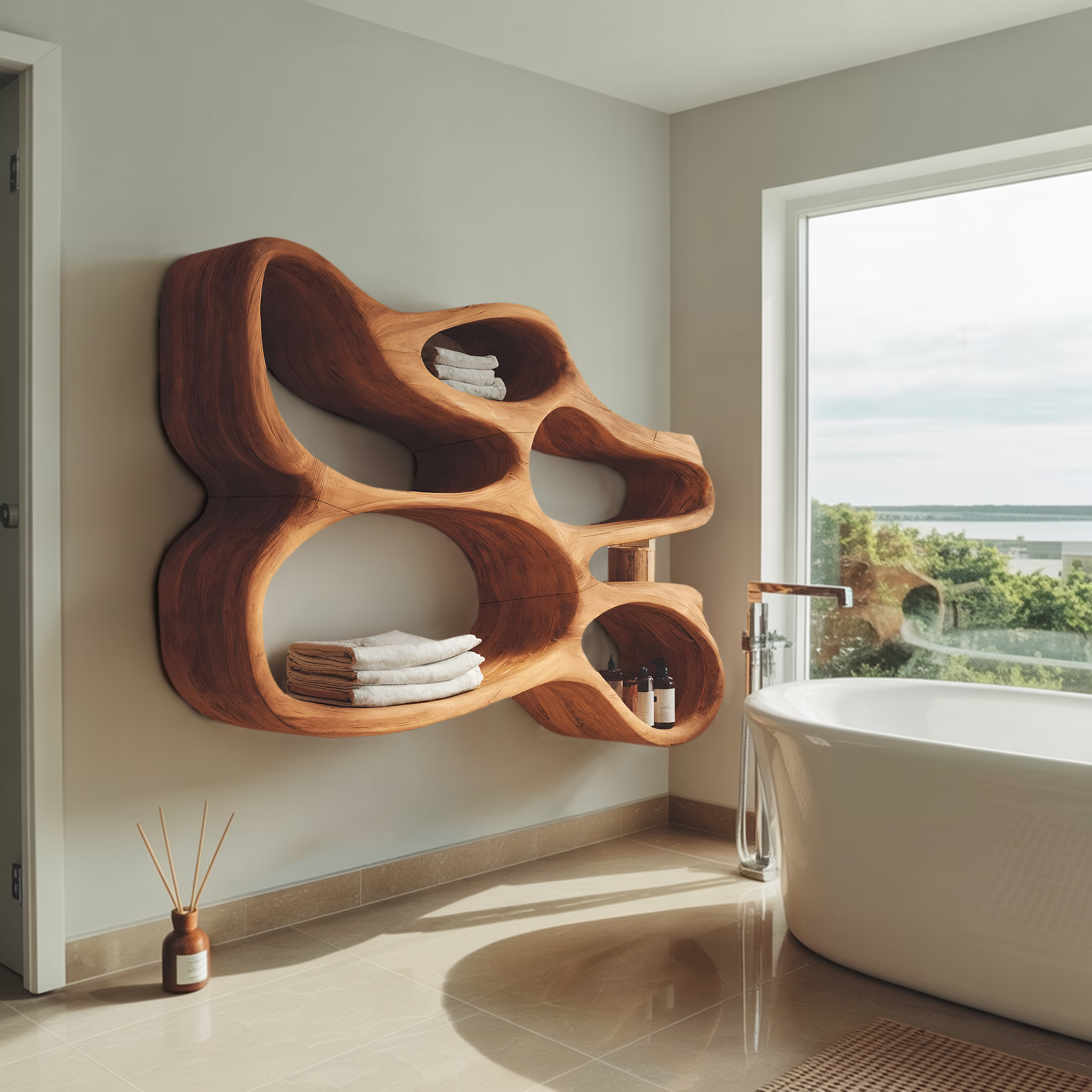 Interwoven wooden volumes shape the wall with Modern Wall Shelf For Bathroom Interior Design, forming a sculptural arrangement that blends storage with spatial flow. The softly contoured compartments create distinct zones for towels, bottles, and daily essentials while maintaining a continuous visual rhythm across the surface. Its fluid structure allows the shelf to feel integrated into the wall rather than applied on top of it, contributing to a calm and balanced bathroom environment.