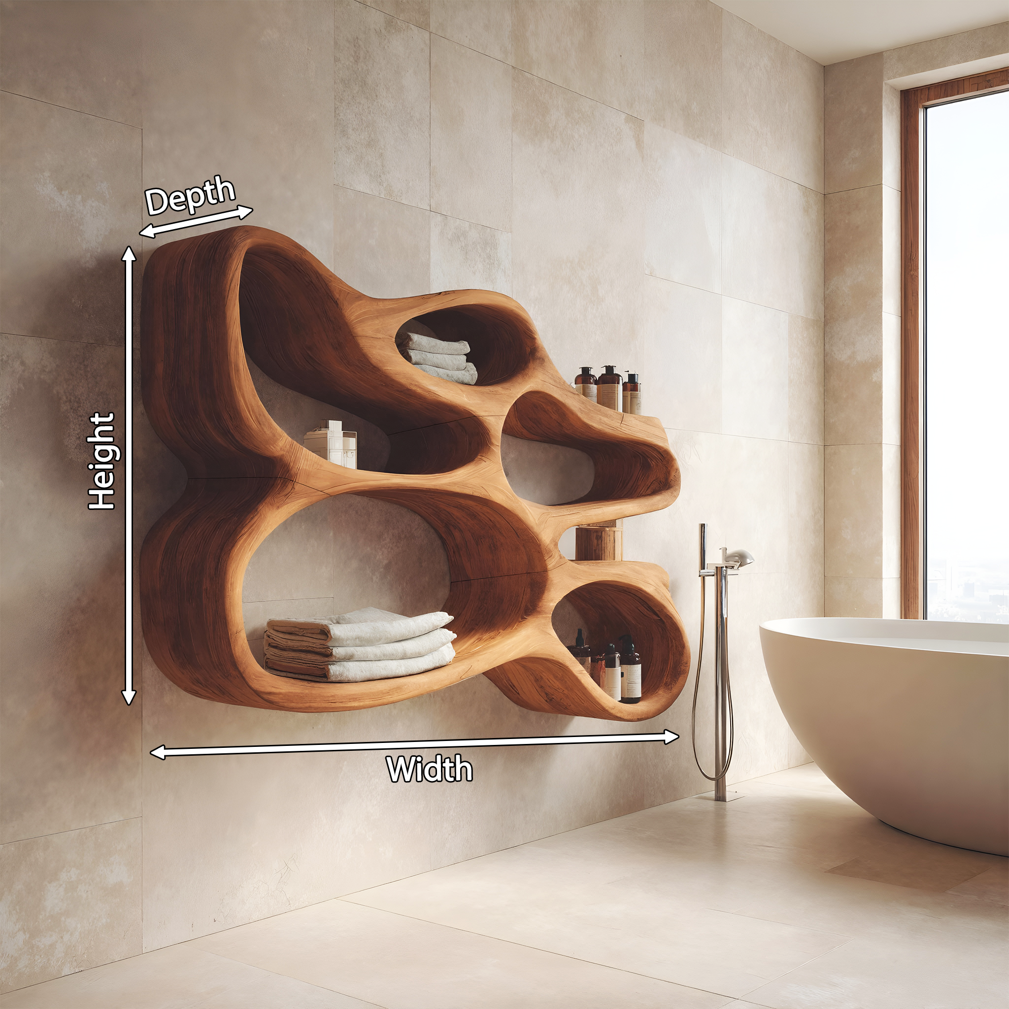 - Versatile Placement: Well-suited for placement beside bathtubs, along open bathroom walls, or as a focal storage element in spacious interiors, this wall shelf adapts easily to different layouts. Its sculptural form works particularly well in areas where storage needs to remain visually light while still offering generous capacity.