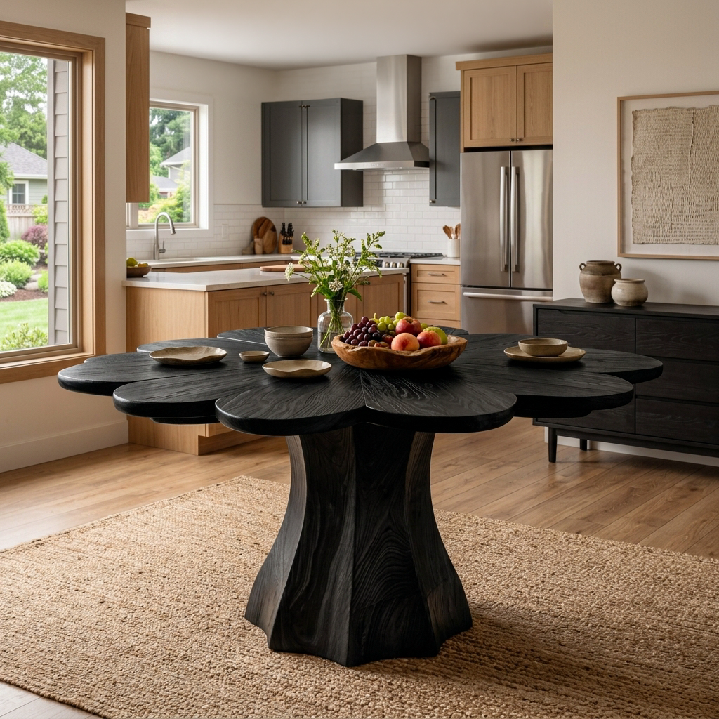 - Functional Benefits: The round tabletop encourages comfortable seating and easy interaction, while the sculptural base allows flexible chair placement without obstruction. Its open underside supports convenient cleaning, helping maintain a clean and organized dining space.