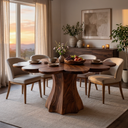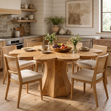 Organic contours anchor the presence of the Farmhouse Wooden Dining Table With Sculptural Base For Dining Room, where the rounded top rests upon a fluid, carved base that forms a continuous and eye-catching silhouette. The interplay between solid form and open space beneath the table creates a sense of depth while allowing light to move freely around it.