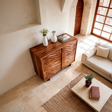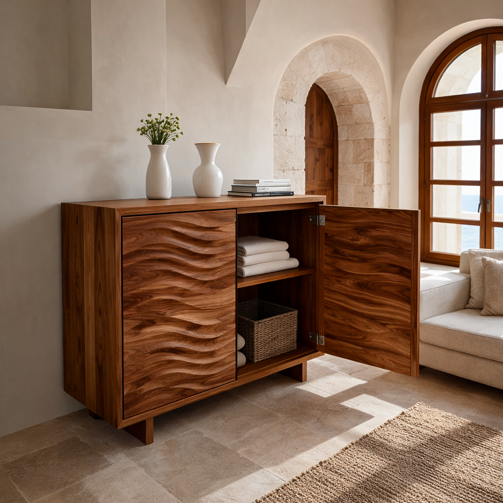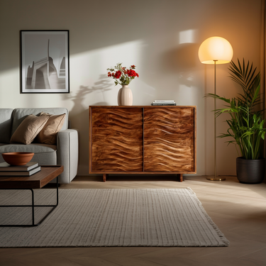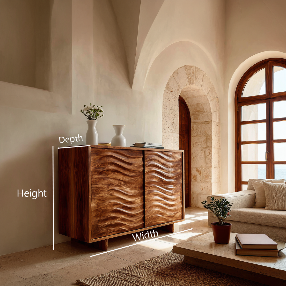 Soft sculpted wood ripples define Modern Wooden Sideboard With Flowing Wave Doors For Living, where carved wave patterns move fluidly across the cabinet doors. The layered contours interact with natural light, revealing depth and subtle highlights within the wood grain. This continuous carved surface introduces gentle movement and texture to the piece, allowing the sideboard to stand out as both functional storage and a visually engaging element within the room.