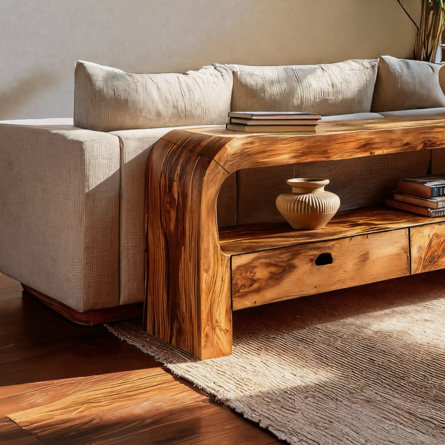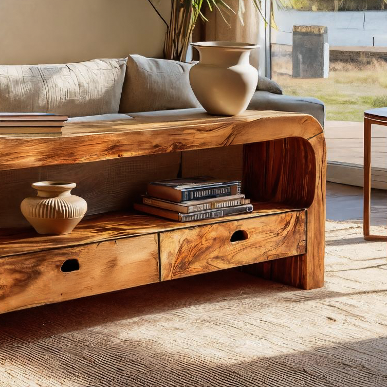 Shaped with gentle lines and warm natural character, the Organic Console Table With Curved Base For Hallway brings a soft sculptural presence to your home. Its curved solid-wood frame flows seamlessly into open shelving, while the lower drawers offer practical storage for everyday essentials. The expressive grain and handcrafted contours give this console table an inviting, organic feel—perfect for adding warmth and function to any hallway or living space.