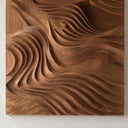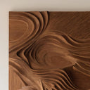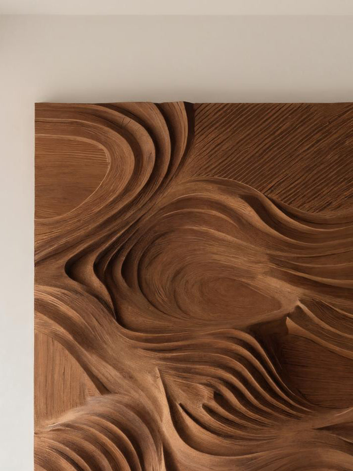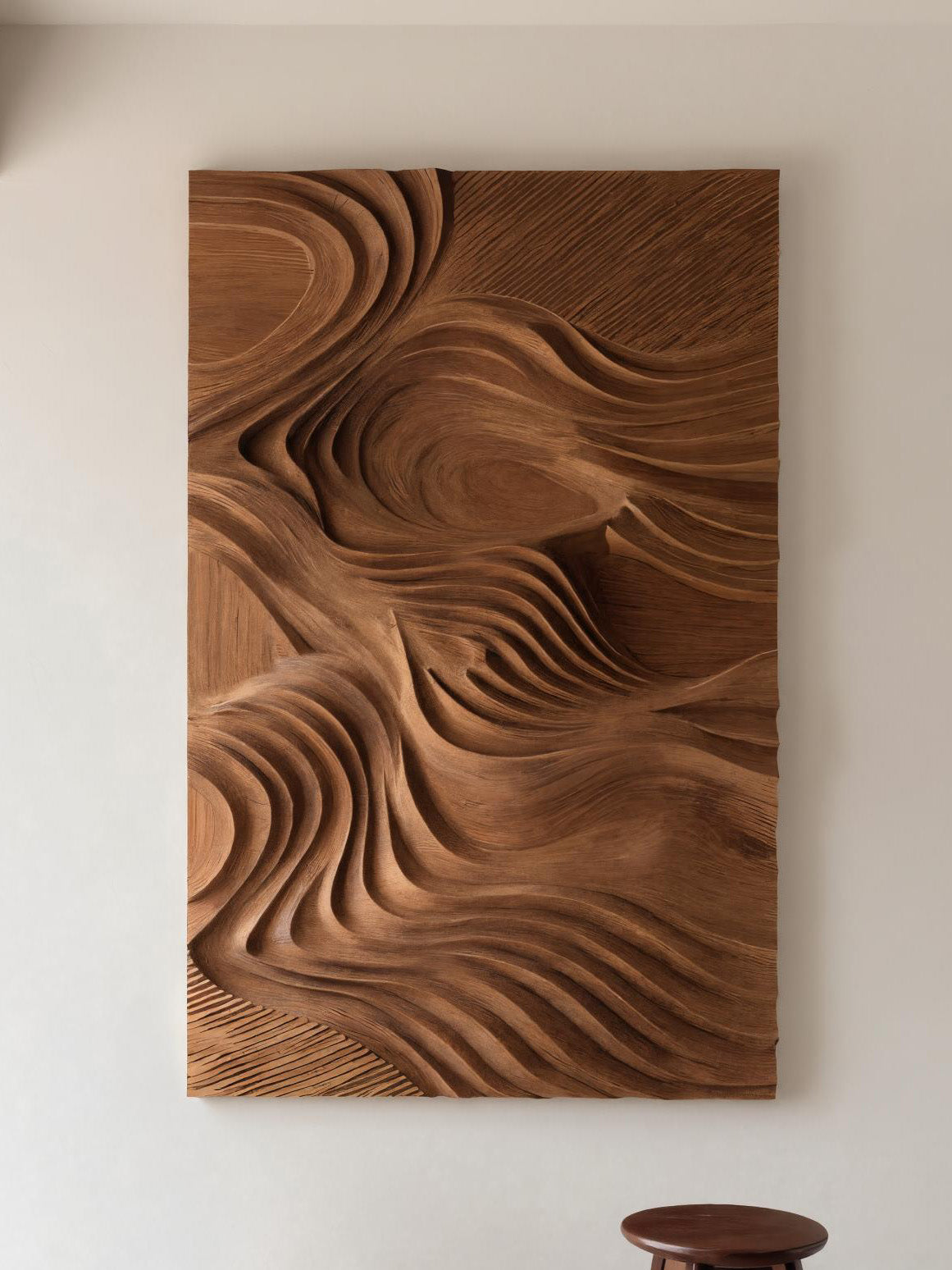 This wall panel showcases a multilayered carved surface shaped by sweeping curves and intricate ridges. The fluid patterns mimic natural formations, creating a dynamic interaction with light and shadow throughout the day. Despite its bold presence, the clean rectangular frame keeps the design minimal and refined.