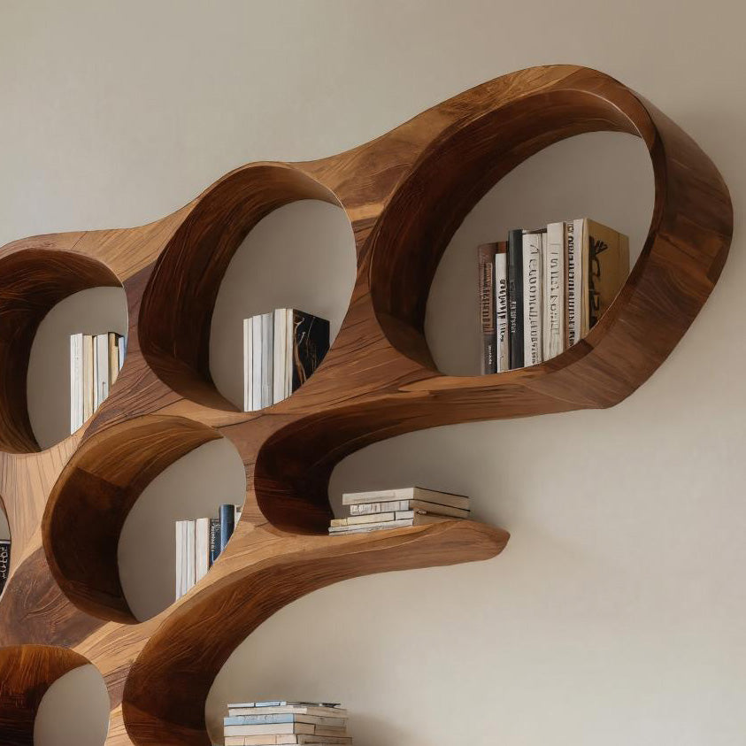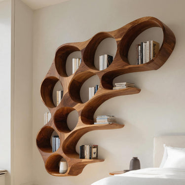 Interconnected wooden curves form the structure of the Organic Honeycomb Shaped Wall Mounted Bookshelf For Bedroom, creating a layered wall display with depth and gentle movement. The bookshelf is composed of rounded, cell-like compartments that flow into one another, offering individual spaces for books and small decorative items. The continuous wood grain travels across each curved section, adding visual continuity while allowing the piece to function as both storage and a sculptural wall element. Its wall-mounted design makes it especially suitable for bedrooms, where it provides practical display space without occupying the floor.