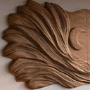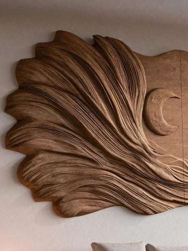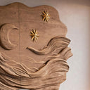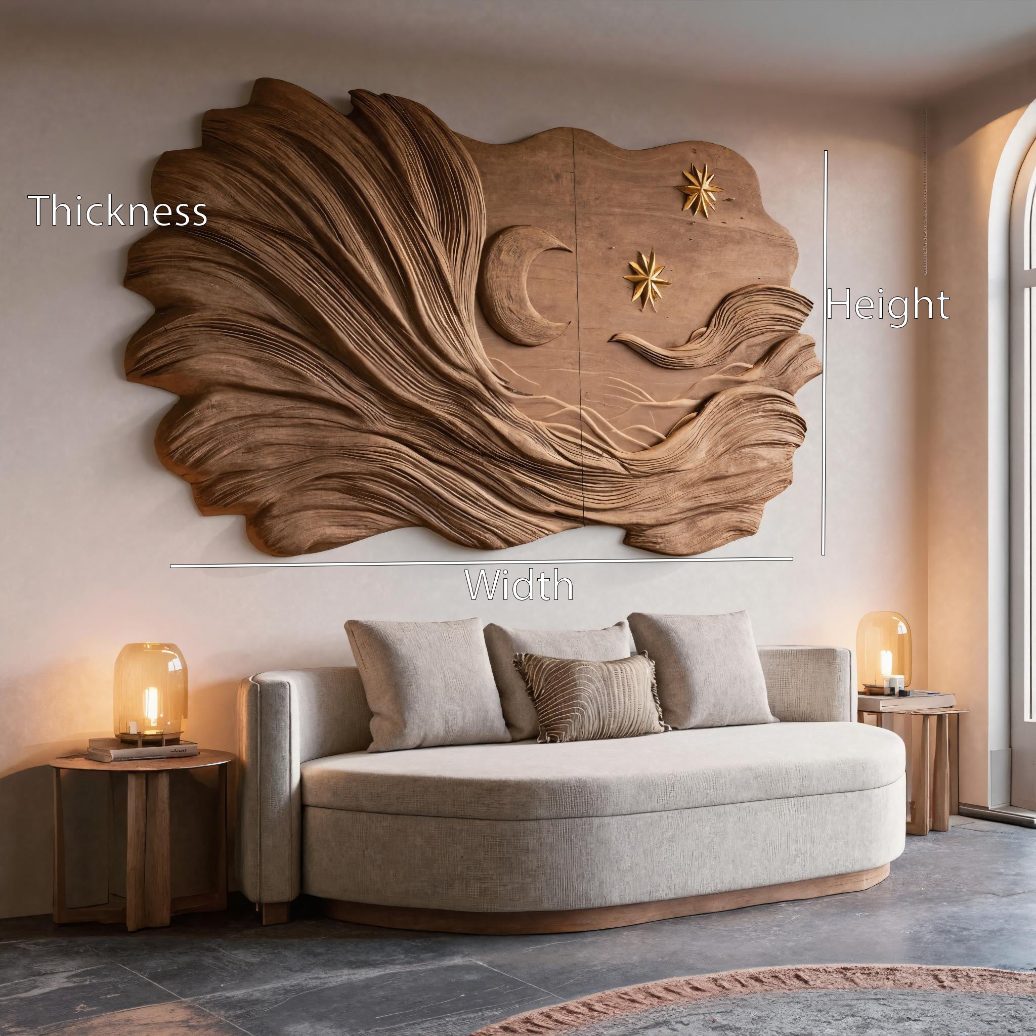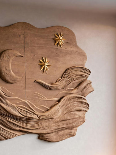 This sculptural wall panel features sweeping carved textures that resemble drifting night clouds, gently guiding the eye toward a crescent moon and star elements. The fluid edges and layered depth give the piece a soft, natural rhythm, allowing it to harmonize with a wide range of contemporary living spaces. Warm wood tones and gentle curves create an inviting presence that brings both visual interest and a calming mood to the room.