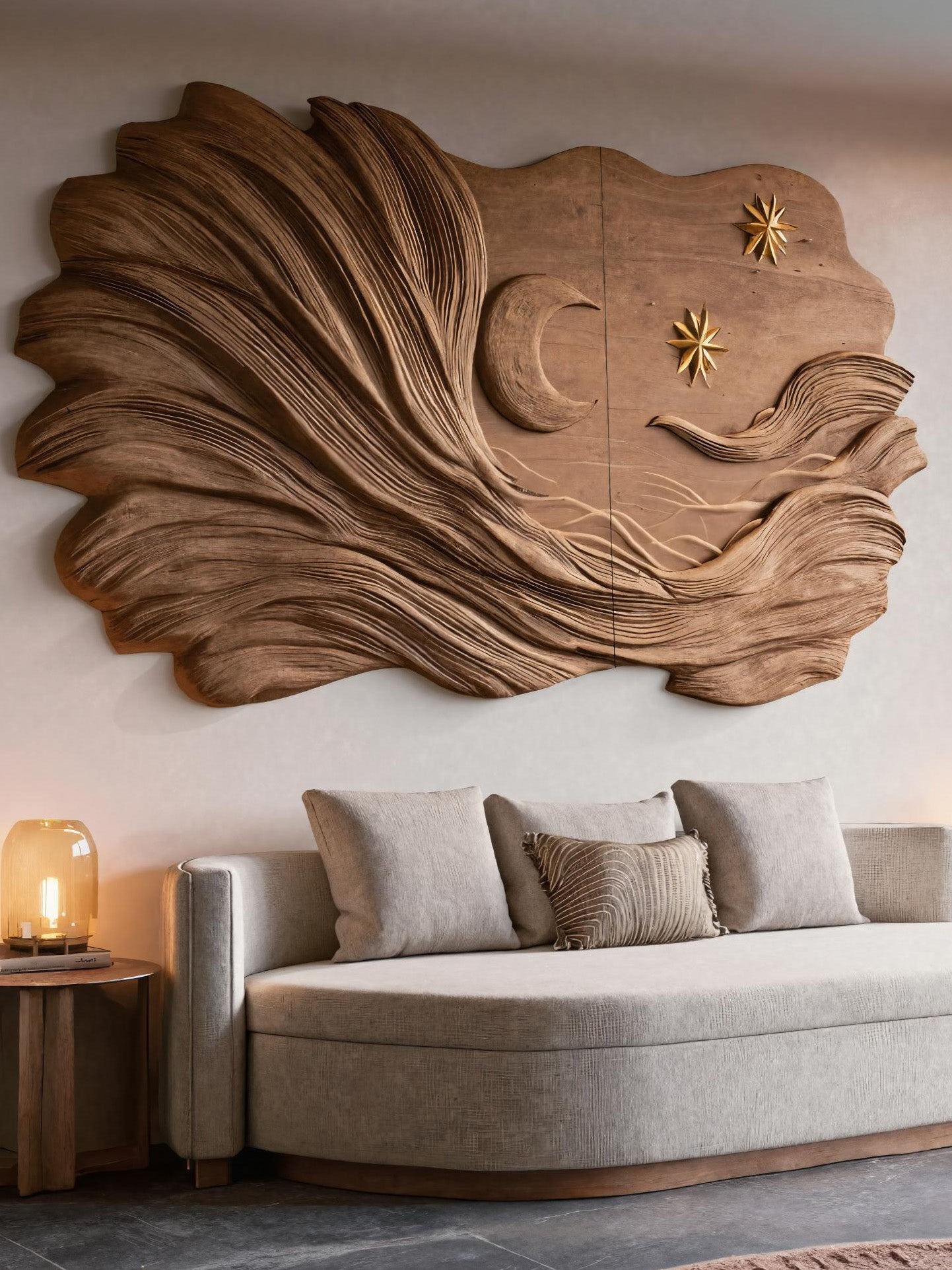 Transform your space with the Organic Moon And Star Carved Sculpture Panel For Living Decor, a statement wall feature that blends flowing carved lines with serene celestial accents. Designed to introduce movement, warmth, và a poetic atmosphere into your home, this panel becomes an expressive centerpiece that enriches the surrounding interior.