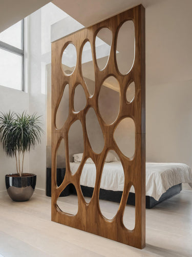 This divider features a visually striking pattern of soft, irregular cutouts inspired by organic forms. The smooth curvature of each opening adds depth and rhythm, creating a functional partition that also acts as a decorative focal point. With its clean edges and balanced structure, the design works effortlessly in both open spaces and more intimate layouts.