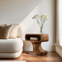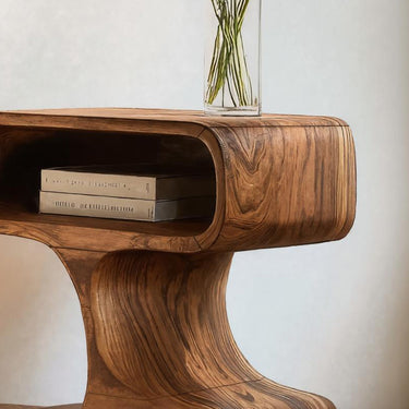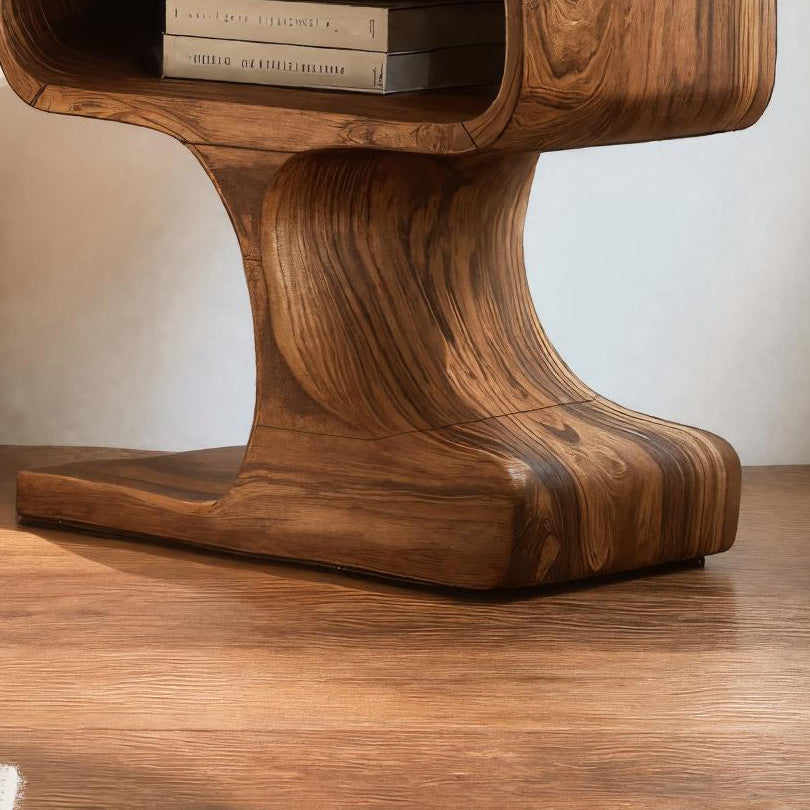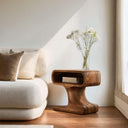 Gentle curves and compact form shape Handcrafted Side Table With Minimal Style For Living into a quiet presence that complements everyday living spaces. The sculpted solid wood structure flows seamlessly from base to top, forming an integrated silhouette with a recessed storage nook beneath the tabletop. Expressive wood grain wraps continuously around the form, creating a natural sense of movement while offering a practical surface for daily use.