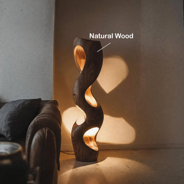 Carved flowing curves give form to the Organic Sculptural Floor Lamp For Modern Living Room, presenting a vertical lighting piece that reads as both object and illumination. The sculpted wooden body twists upward with smooth, continuous movement, revealing softly hollowed openings that allow light to spill outward in layered patterns. As light passes through the carved interior, it creates gentle shadows and warm highlights, turning the lamp into a visual anchor that enhances the atmosphere of living rooms and thoughtfully arranged interior spaces.