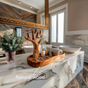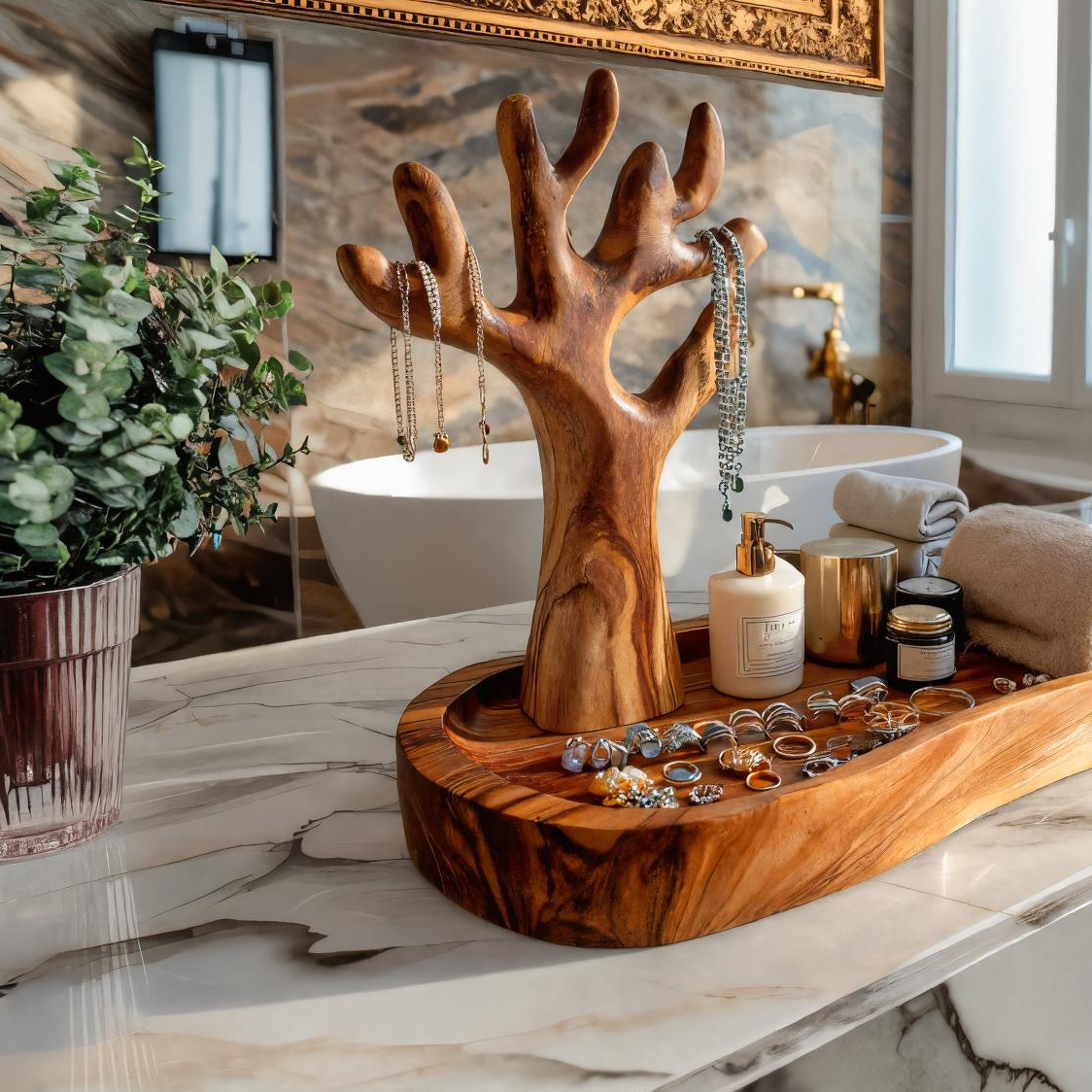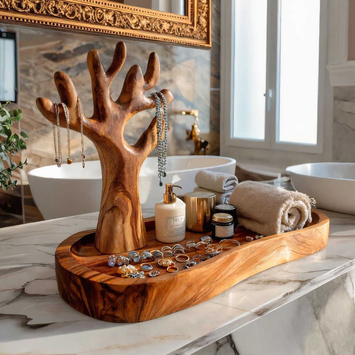Designed with a warm, nature-inspired aesthetic, the Rustic Jewelry Holder For Bathroom Or Bedroom Decor showcases a hand-carved branching form rising from a gently contoured base tray. The organic silhouette creates a functional display piece that brings both texture and character to any vanity, offering an artful way to hang necklaces while keeping rings and small accessories neatly gathered below.
