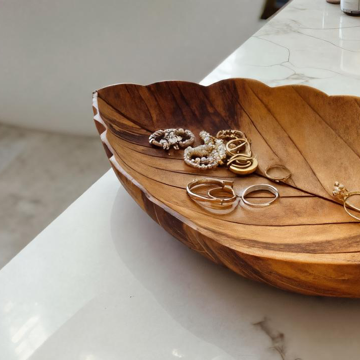 Evoking the gentle charm of nature, the Rustic Leaf Carved Jewelry Tray For Bathroom is shaped like a hand-carved leaf with defined veins and a softly curved surface that naturally gathers jewelry and small essentials. Its rustic texture and warm wood tones make it both a decorative accent and a functional catch-all, perfect for enhancing the serenity of a bathroom setting.