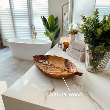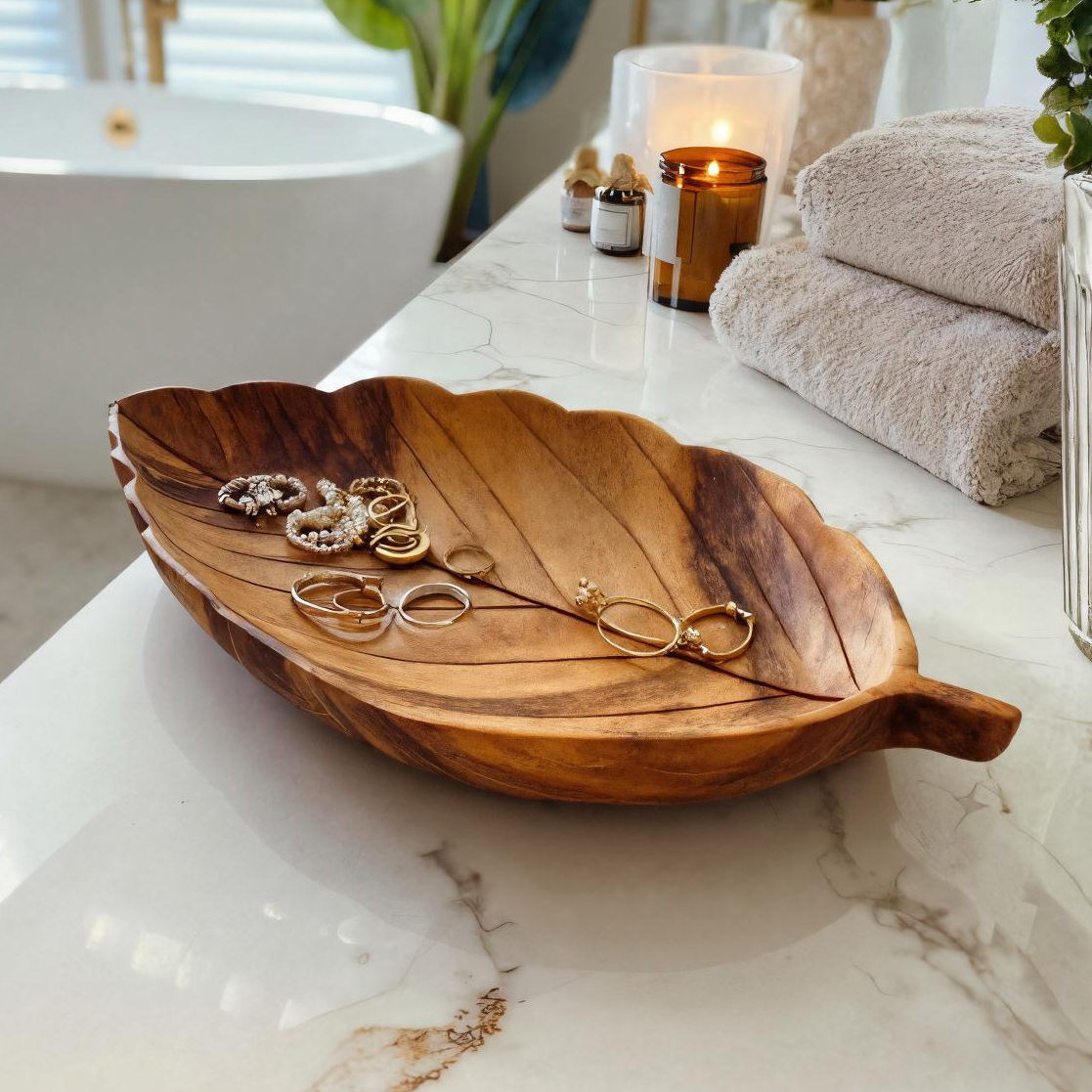 - Versatile Placement: Ideal for bathroom vanities, tub-side surfaces, dressing tables, or nightstands, this leaf-shaped tray blends easily into warm, nature-inspired, contemporary, or rustic interiors. It is well-suited for organizing jewelry, hair accessories, small self-care items, or decorative accents.