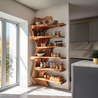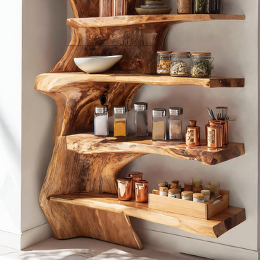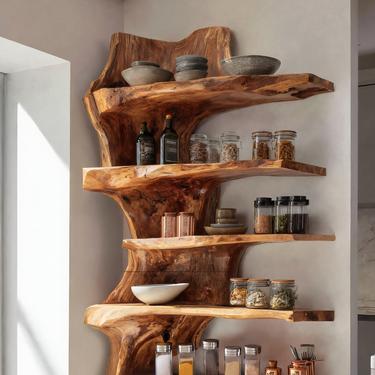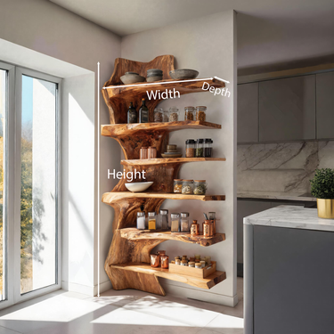- Functional Benefits: The staggered, organic live-edge shelves offer generous room for organizing daily ingredients while adding sculptural beauty to the space. Its corner-hugging design maximizes storage without crowding the room.