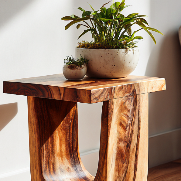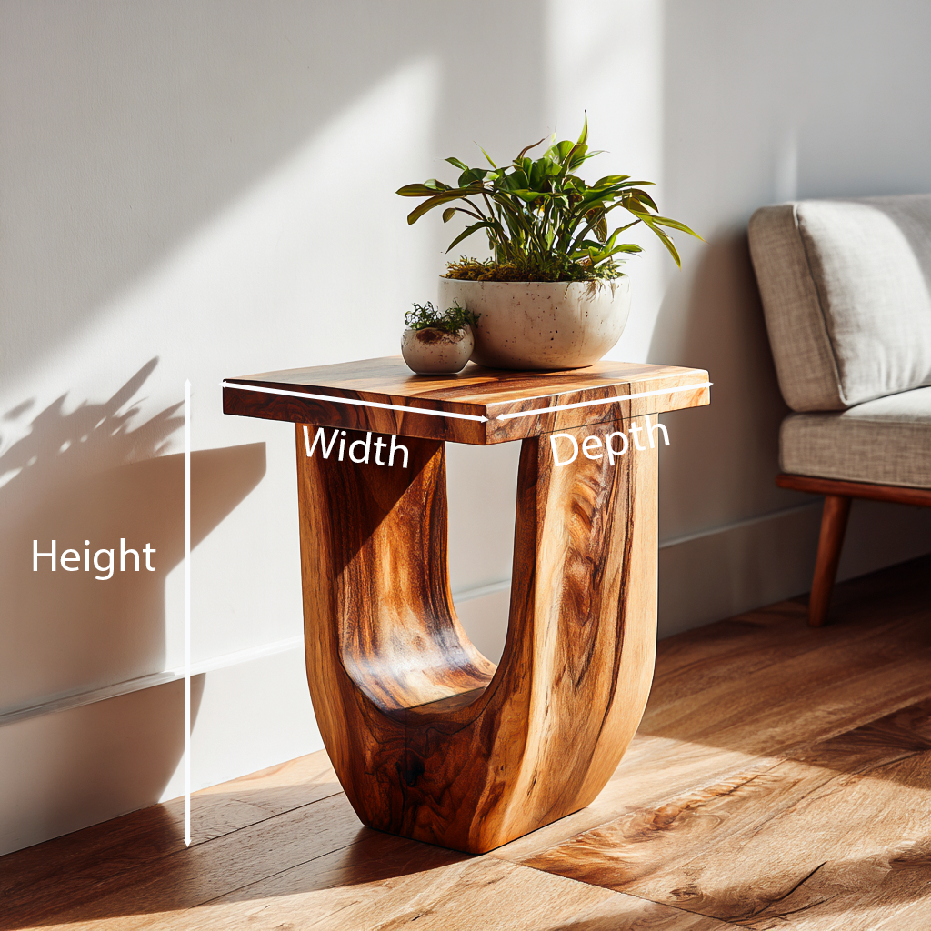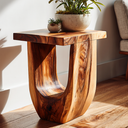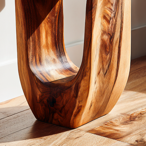 Balanced geometry and softly hollowed form define the character of the Rustic Modern Side Table For Home Decor, allowing solid wood to feel sculptural while remaining visually light. The table is carved from a single block, featuring a curved internal opening that introduces depth and subtle contrast. Flowing grain patterns travel seamlessly across the surface, highlighting natural variation and adding visual interest from every angle. When placed beside seating or along a wall, it becomes a quiet focal element that complements surrounding furnishings without overpowering the space.