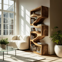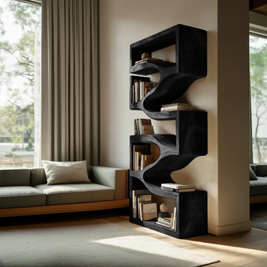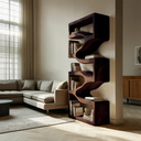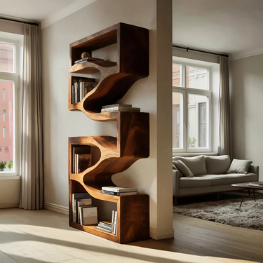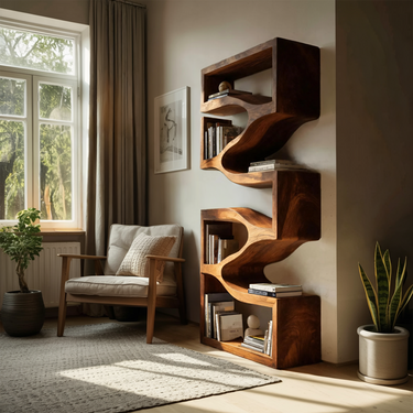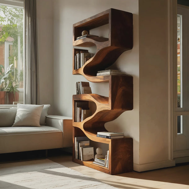 Gently flowing wooden forms shape the Sculptural Wooden Wall Bookcase For Modern Bedroom, turning a vertical wall into a layered display with natural movement. The bookcase is composed of a continuous curved structure, where each shelf emerges seamlessly from the central form to create distinct storage zones. Expressive wood grain follows the curves throughout the piece, adding depth while offering generous space for books, personal objects, and small décor items. Its wall-mounted design allows it to function as both storage and a visually engaging wall feature, particularly well suited for bedroom environments.