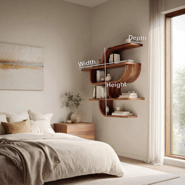 - Functional Benefits: The layered shelves provide ample room for organizing books, décor pieces, framed photos, or plants while maintaining an airy and refined aesthetic. The curved central form adds visual movement, turning everyday storage into an artistic focal point. Its wall-mounted structure helps save floor space and keeps the room feeling open and uncluttered.