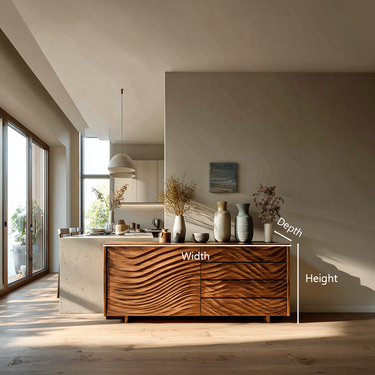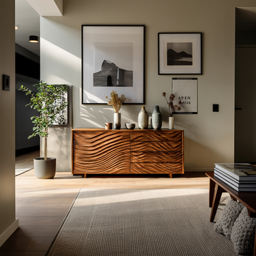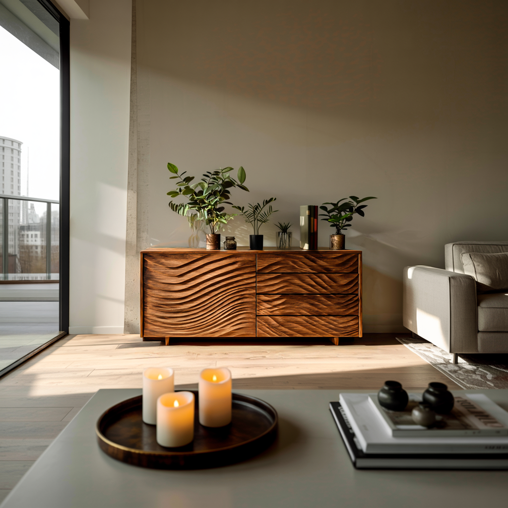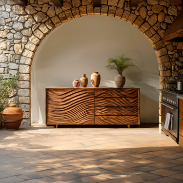 Layered wave carvings shape the identity of our Wooden Sideboard With Sculpted Wave Doors For Modern Interior, bringing a sense of motion and visual depth to everyday storage. The sculpted front panels form flowing lines that echo natural patterns, while the warm natural wood grain highlights the gentle contours of each carved surface. Its long, balanced silhouette allows the piece to integrate seamlessly into open interiors, where texture and light interact across the sculpted façade.