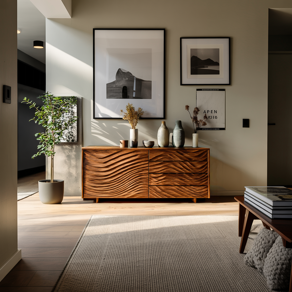 Wooden Sideboard With Sculpted Wave Doors For Modern Interior